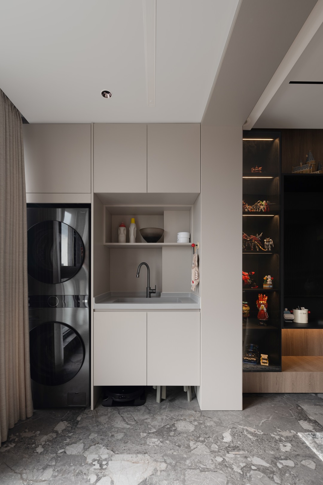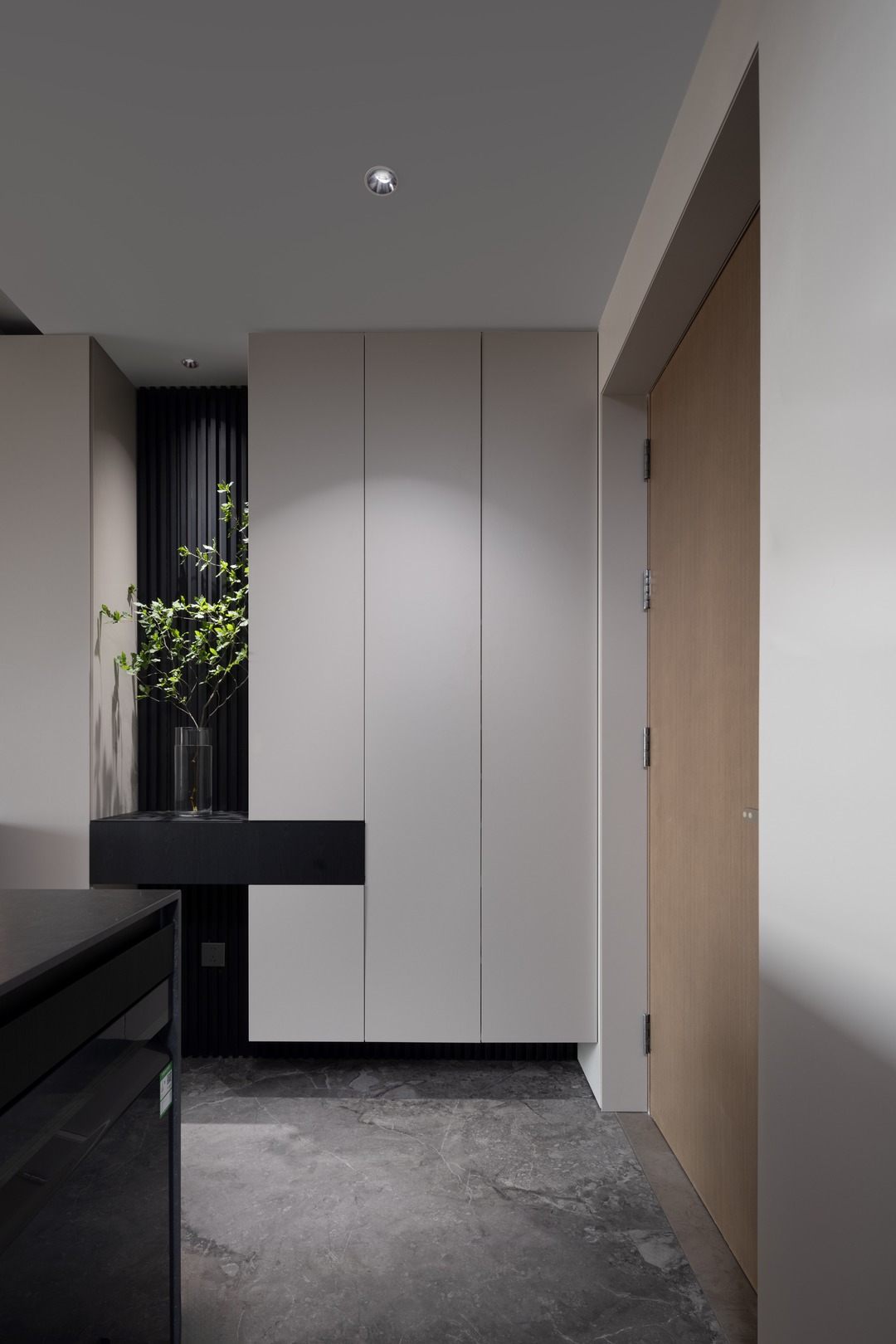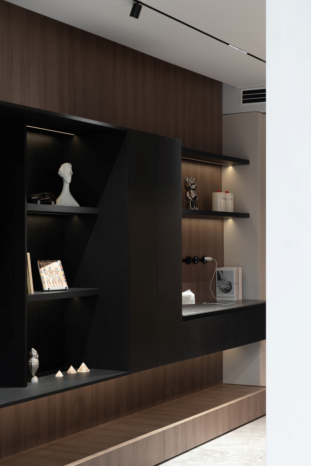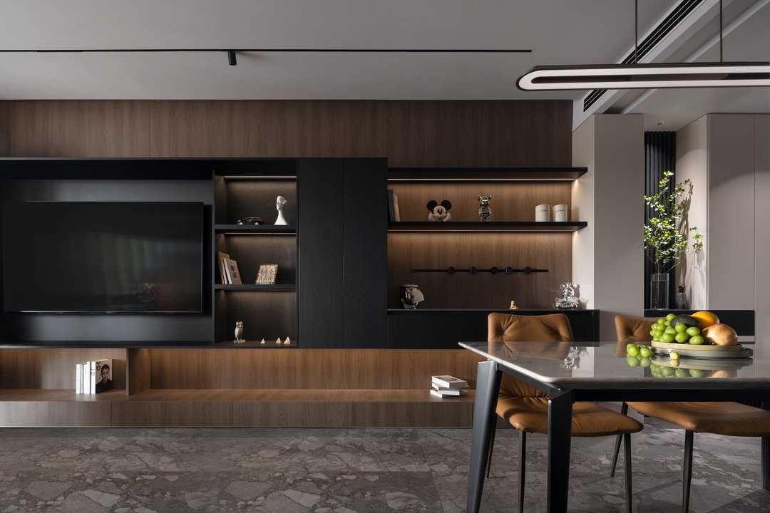 2、客餐厅设计融合手办展示,餐边柜,打印区域,鞋柜功能在以上功能需求下我们设计的整体背景统一性,视觉拉长空间感,色彩经典耐看。