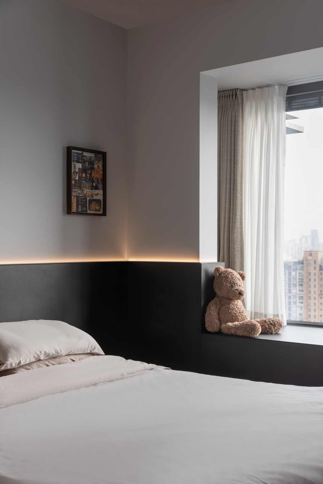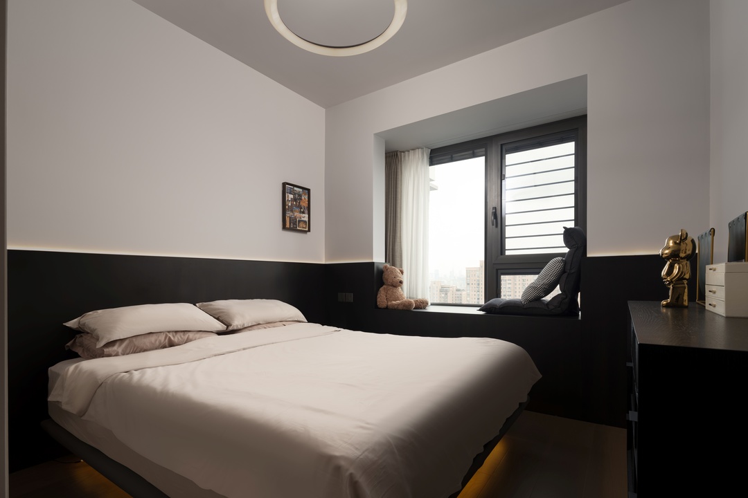 晨起时,晨光先漫过飘窗的玻璃,再落在延伸到窗底的黑色木饰面上,木饰面从床头一直铺到飘窗底部,肌理在柔光里格外清晰。半高的床头背景板也是同块木色,3000K 的反光灯带刚好藏在木饰面顶端,暖光不刺眼,只顺着墙面漫下来。