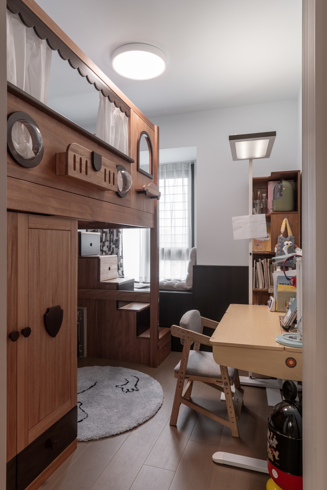 儿童房的设计,要满足孩子睡眠、学习、收纳和玩耍的多重需求,我们为此定制了 1.5米高的高低床。这个高度可是经过精心考量的,下层净高 1.4 米,孩子在下面活动不会觉得压抑,上层净高 1.1米,睡觉也很舒适。楼梯每阶都内嵌抽屉,充分利用每一寸空间。飘窗改造成 阅读角,铺上软垫,孩子可以边看书边欣赏窗外的城景。