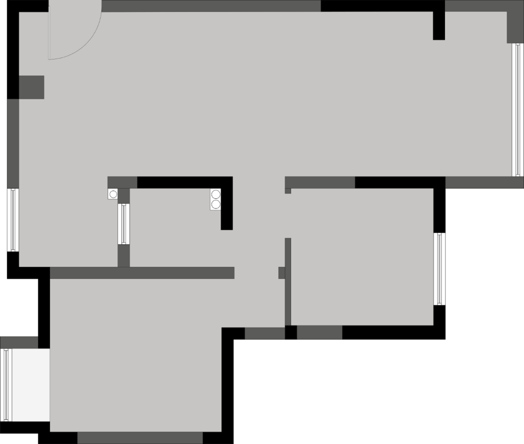 首先我们来看看原始户型图。进门首先是有一个小玄关,原本厨房一侧的墙体已经被六六事先拆除;客厅区域就是一个竖厅,紧接着空间比较鸡肋的就是最靠里的主卧。在此基础上,要如何改造成一个满足老人生活方式的适老化空间呢?