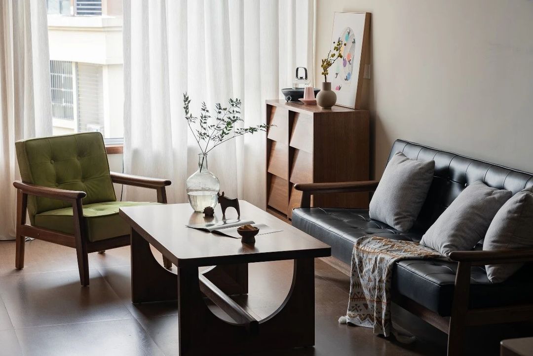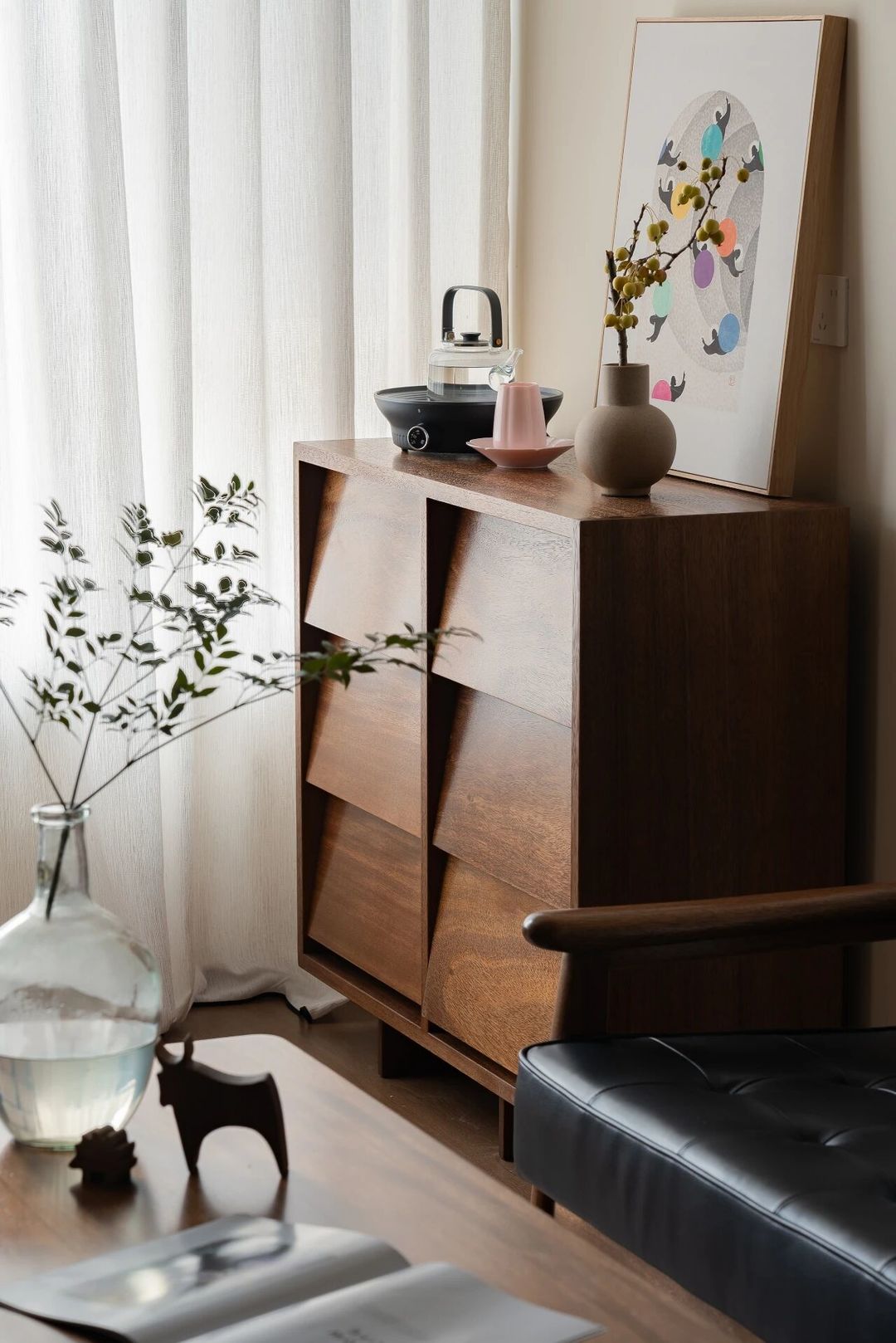 定制的真皮沙发、实木茶几及斗柜,都赋予了空间舒适温润的质感。