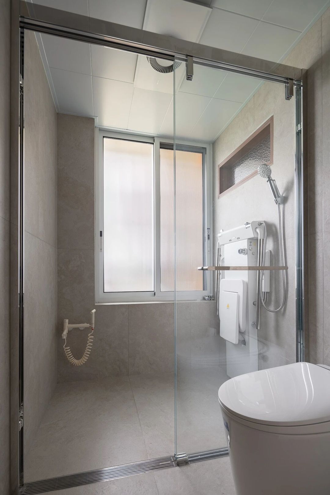 4- 淋浴区预留足够位置放置了坐式淋浴椅,方便老人使用。