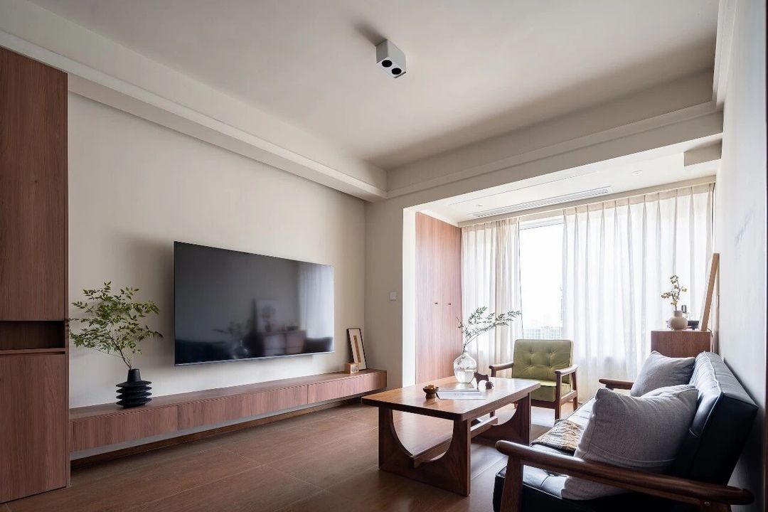 从餐厨区域看向客厅,视野0阻挡,光线直接照亮整个家,大量的木色组合也不会显得很沉闷。