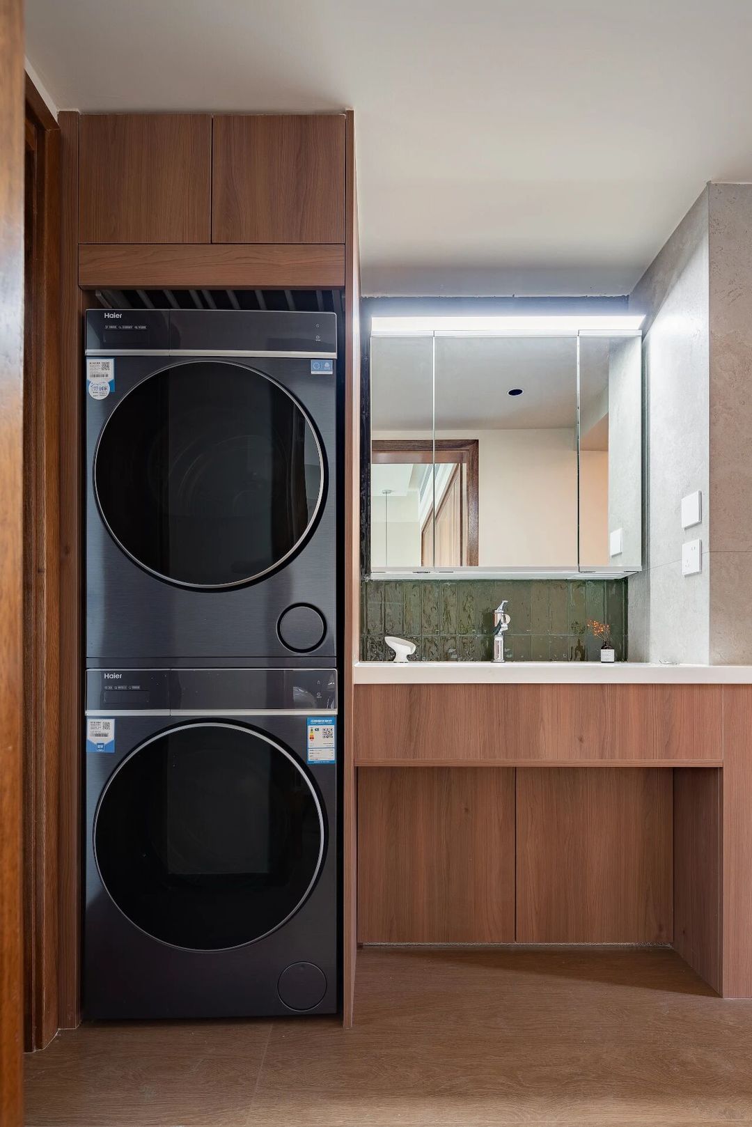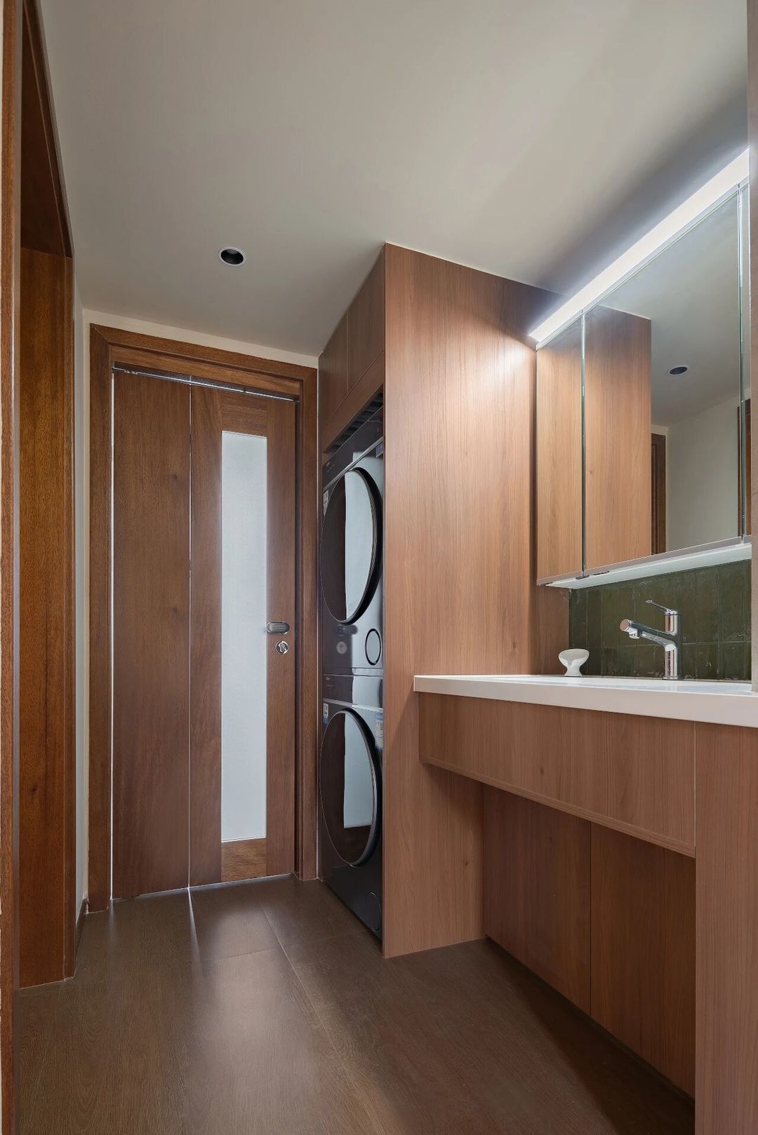 3- 有了厨房让渡出来的空间,卫生间直接爆改干湿三分离。原来的卫生间作为干区放置洗手台和洗烘一体机;剩下的空间分离出马桶和淋浴区,淋浴区增设坐式淋浴椅,更方便家中老人洗浴;