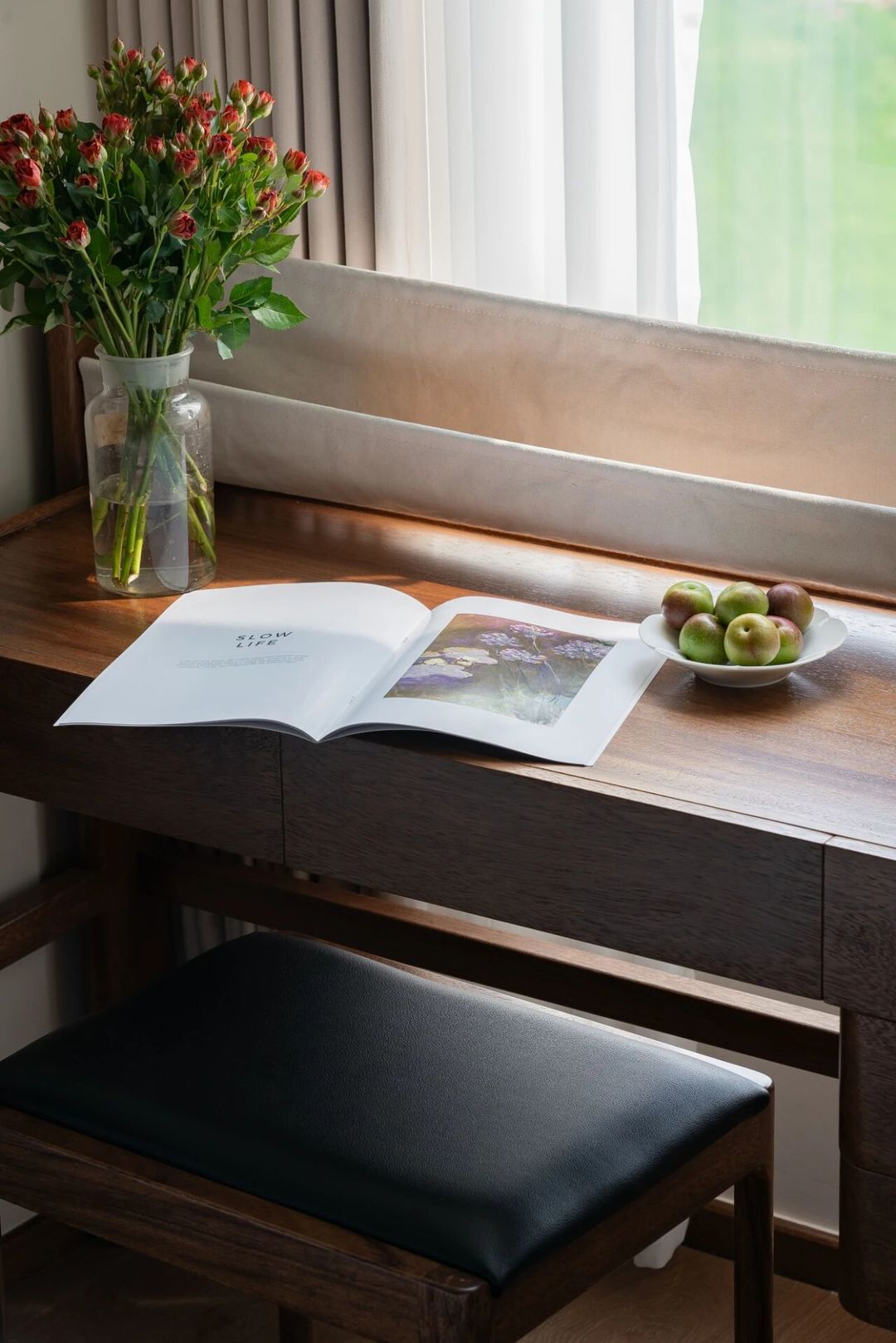 5- 主卧飘窗打掉后在同一位置设计了梳妆台,很好的利用起了窗外光线;