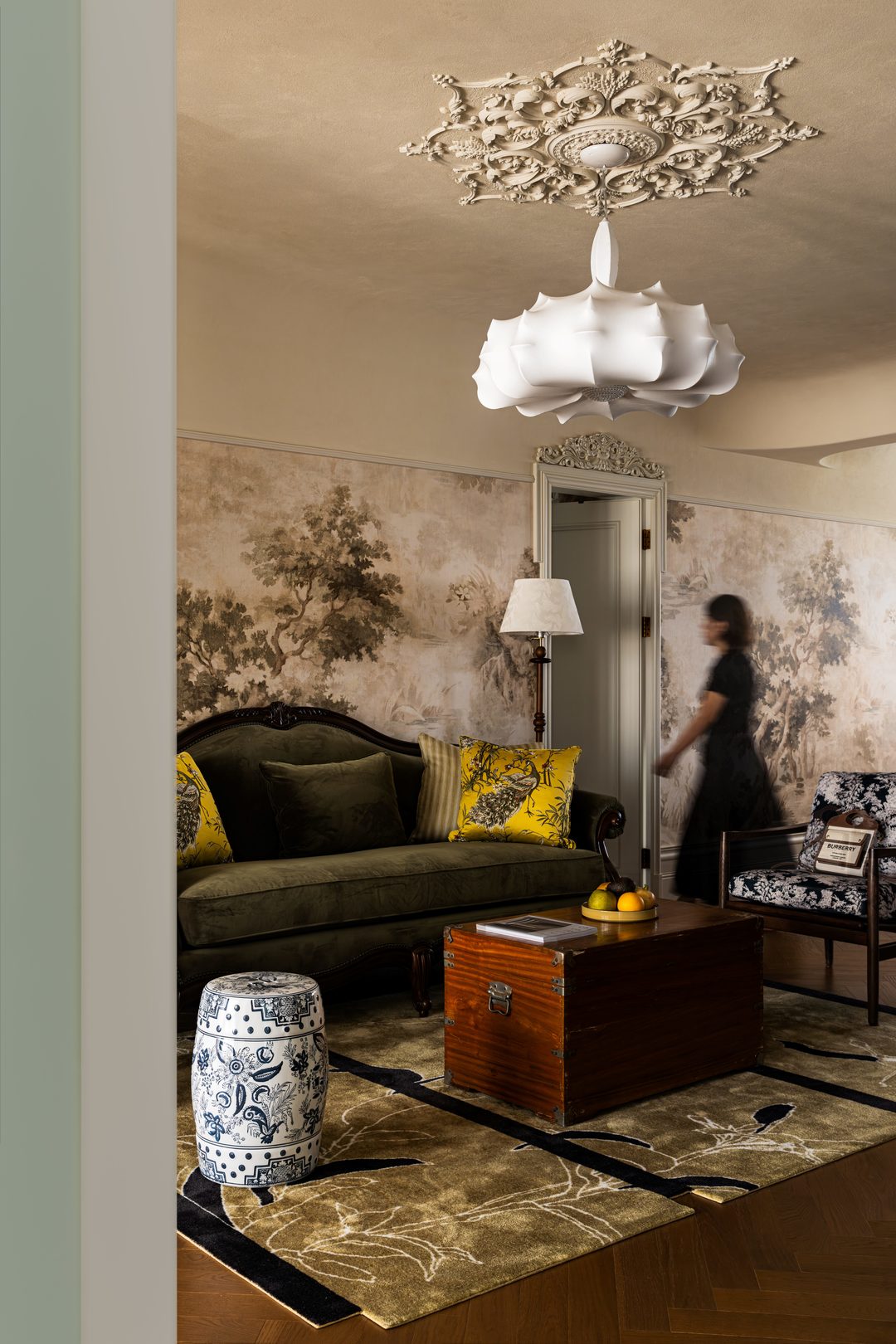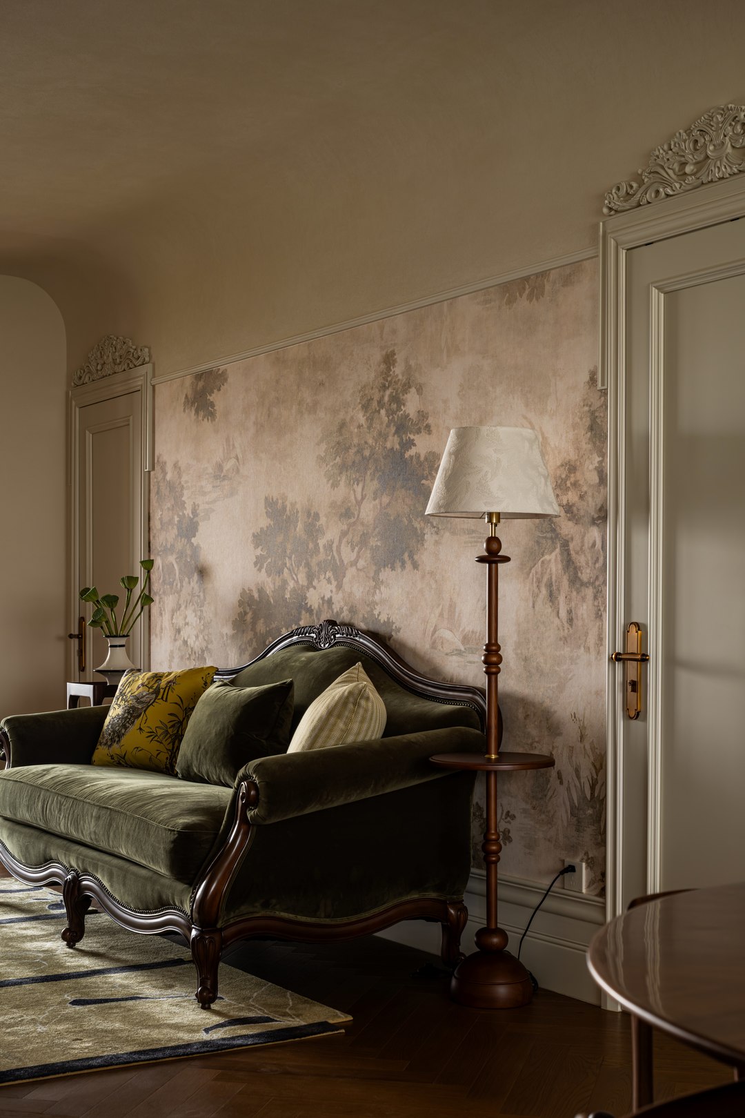 客厅与餐厅仅一步之遥,二者的背景墙无缝衔接,好似一幅徐徐展开的艺术画卷 。法式的房门,线条优雅流畅,精致的雕花与细腻的纹理,尽显法式工艺的精湛,每一次开合都仿佛带着凡尔赛宫的优雅气息。与之相呼应的西洋壁画,将西方艺术的浪漫与神秘融入空间,让人宛如置身于欧洲艺术长廊。