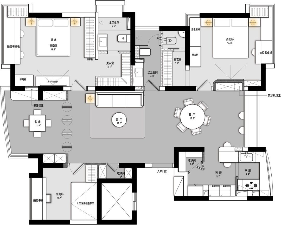 3、改变了原南边长辈房的房门位置,利用原有过道空间面积增加长辈房的衣帽空间。