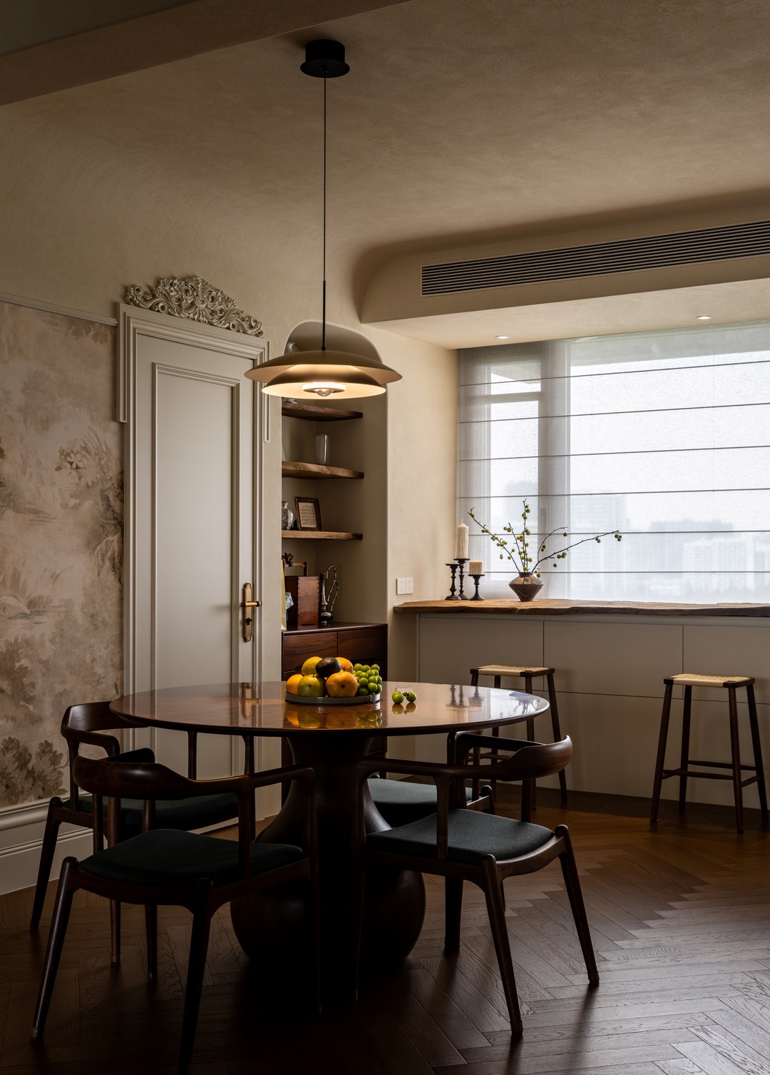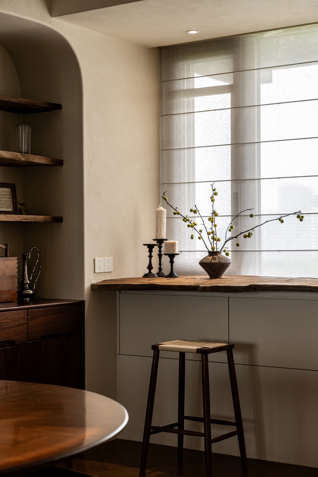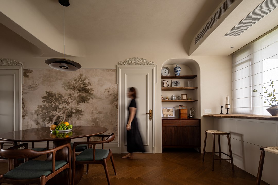 曾几何时,餐厅那扇飘窗还是个略显尴尬的存在,利用率不高,仿佛只是一个被遗忘的角落。但在设计师的奇思妙想与巧手下,它完成了一场惊艳的蜕变,成为家中最惬意的休闲吧台。吧台的台面,是设计师历经波折寻来的一大块老木头。岁月在它身上留下了深深浅浅的痕迹,表面的磨损、细微的裂缝,都是时光馈赠的独特印记,散发着浓厚的历史韵味和自然气息。坐在吧台前,眼前的视野豁然开朗,窗外上海植物园的如画美景毫无保留地铺展开来。在夜幕降临时,与爱人相对而坐,小酌一杯,聊聊生活的点滴,享受这温馨浪漫的二人世界 。