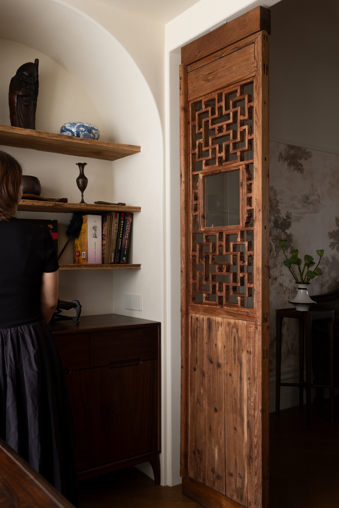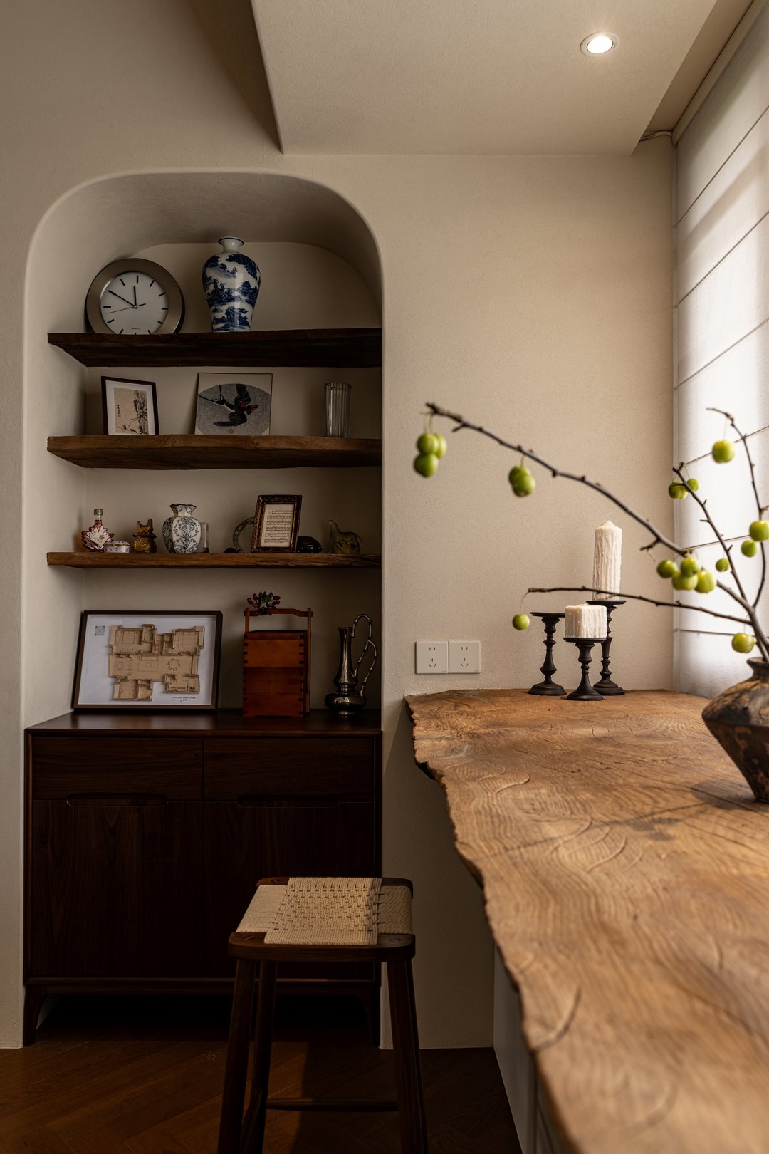 展示柜的木质纹理清晰可见,岁月的痕迹赋予了它一种独特的质感,里面陈列着业主收藏的各类珍贵茶具、古籍善本以及精美的古玩摆件,每一件藏品都在这个充满古韵的空间里找到了属于自己的归宿。