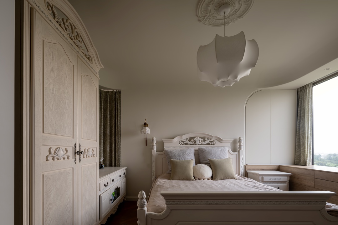 主卧作为业主专属的私密空间,巧妙利用原有的飘窗空间,实现了功能的最大化拓展 。设计了一排与飘窗紧密相连的储物柜,无把手的款式让整体外观更加整洁流畅。飘窗延伸出的书桌区域,更是为业主提供了一方宁静的工作与学习天地。
