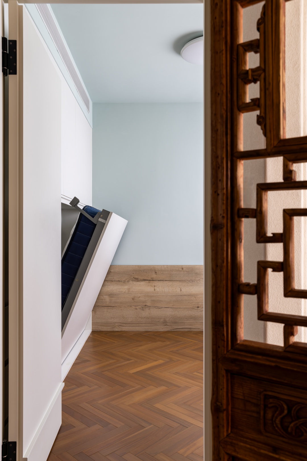 原次卧的空间相对有限,但这并没有难倒设计师,反而激发了他的创意,将空间利用发挥到了极致?。设计师采用了收纳柜与床一体的独特设计,当床收起时,整个次卧可以变成健身区域和书房,让房间的功能更加灵活多变,满足了不同的使用需求?。