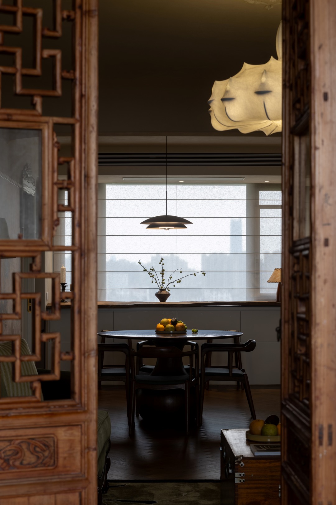 客厅一侧,一扇雕花木门缓缓开启,一间充满古韵的茶室映入眼帘 。作为家中最具文化底蕴的空间,茶室里的每一处细节都饱含着主人对传统文化的热爱与对生活的独特品味,而其中最引人注目的,当属那四扇历经岁月沉淀的老门。这四扇门是业主多年来精心收藏的宝贝,它们承载着厚重的历史记忆,见证了往昔岁月的流转。每一扇门上的雕花、每一处斑驳的漆面,都仿佛在诉说着过去的故事,散发着一种独特的古朴韵味。