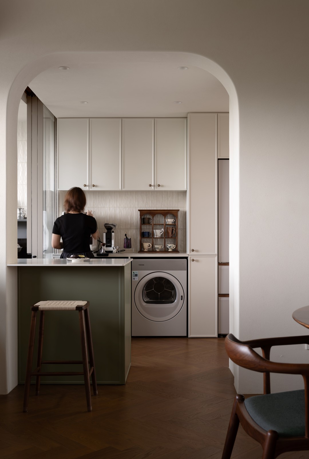 中西厨之间的移门,无疑是整个厨房设计中的点睛之笔?。这扇移门打破了传统移门的常规设计,因空间有限,为了实现空间的最大利用化,其中一扇移门采用了腾空设计?。当移门关上时,中西厨区域既可以完全分隔开来,又能在需要时轻松连通?。在烹饪中式美食时,将移门关闭,有效隔绝油烟,让西厨和客厅等区域保持清爽干净,而在制作西餐或进行简单的烘焙时,打开移门,中西厨空间融为一体,家人之间可以相互协作、互动,享受烹饪的乐趣?。