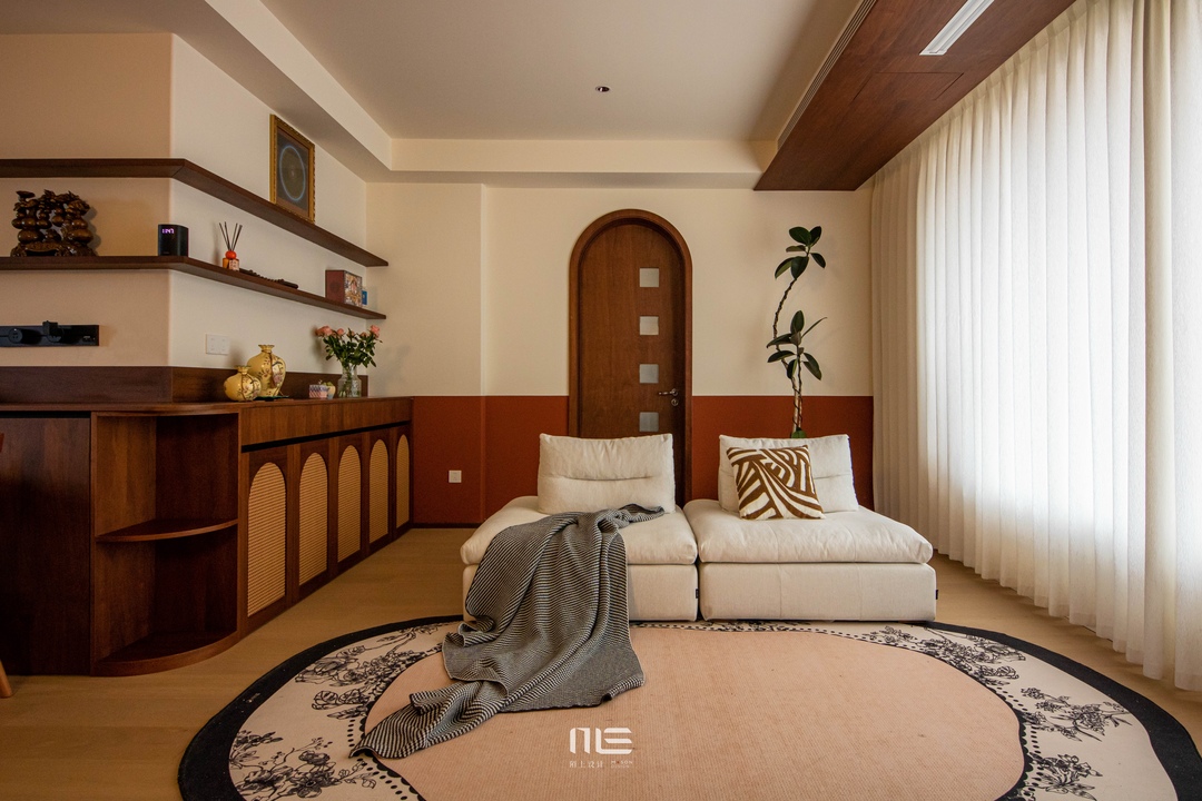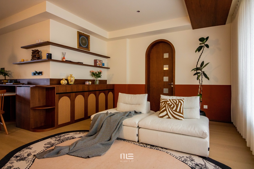 焦糖棕与米白的墙色碰撞,藤编柜与艺术地毯的质感交织,还有那扇弧形木门,像藏着旧时光的温柔褶皱。当阳光透过白纱洒在软乎乎的沙发上,每一处细节都在宣告:这不是普通的居所,是能把日子过成艺术的「私属美学空间」。