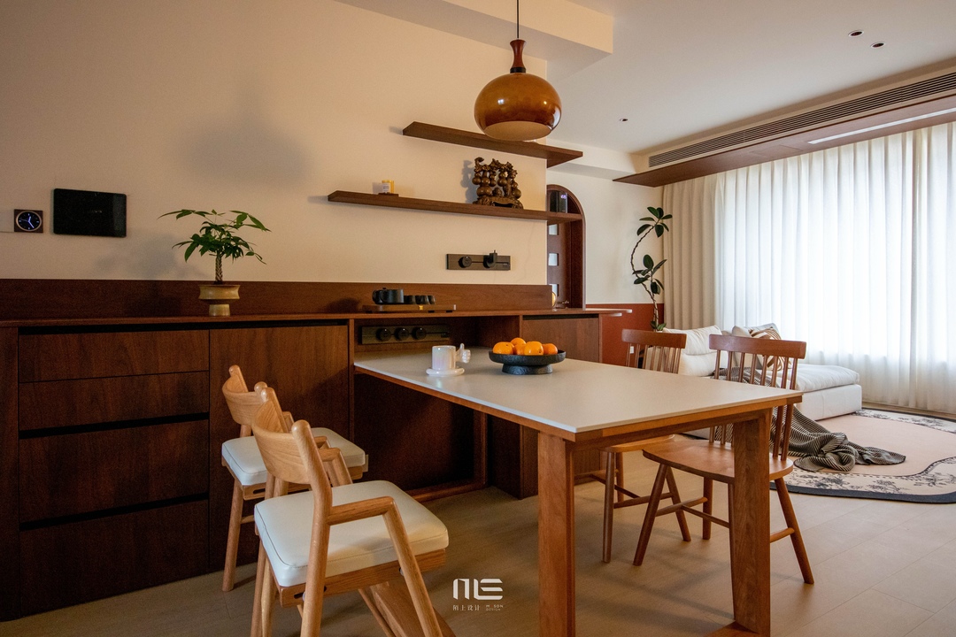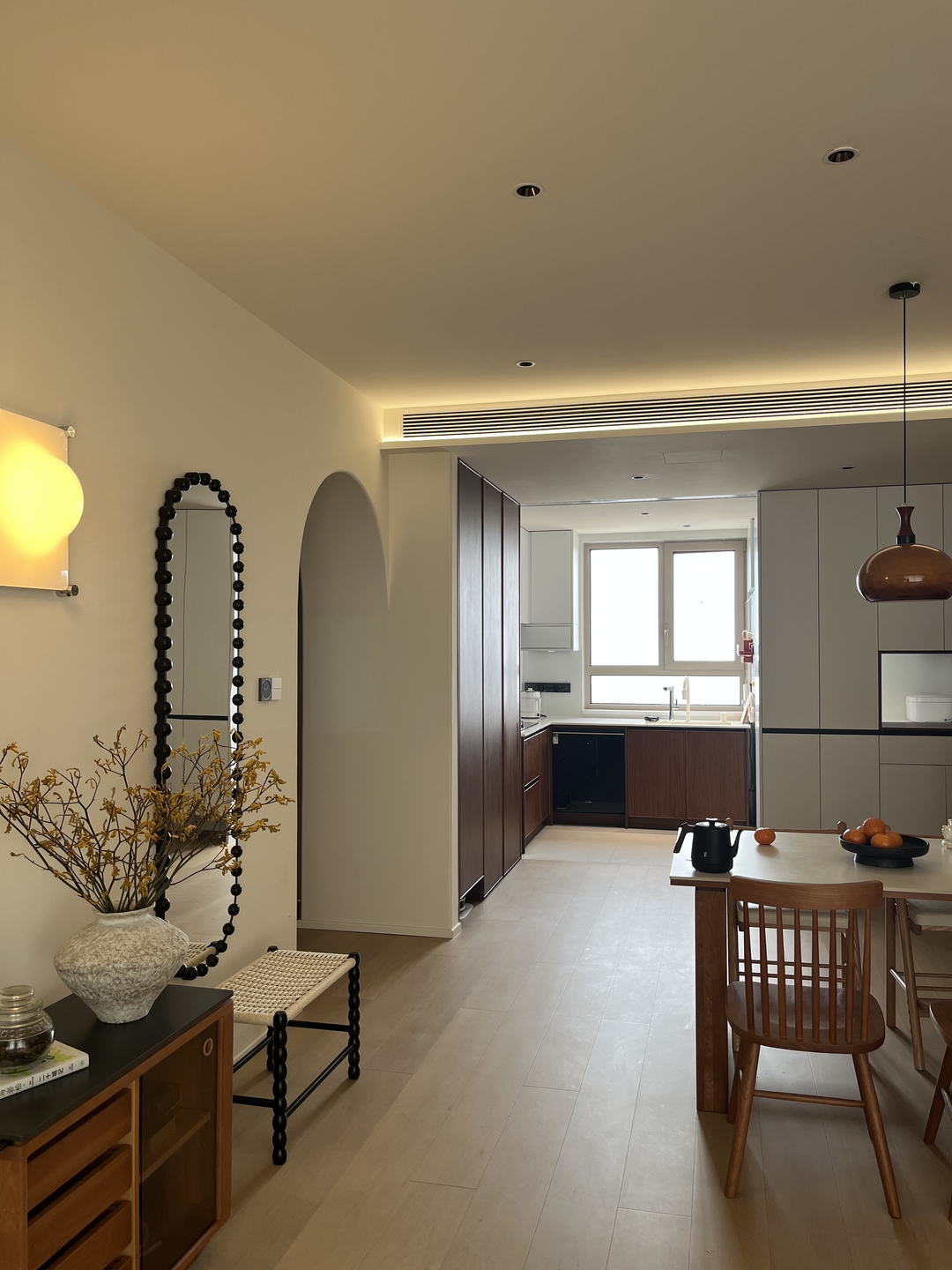 暖棕餐桌摆着鲜橙,艺术感灯具洒下柔光,让三餐四季都成了治愈的仪式;弧形拱门串联起空间的层次,藤编细节与艺术挂画碰撞,把复古腔调揉进日常。