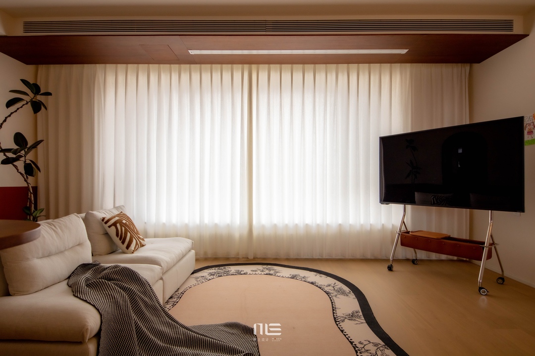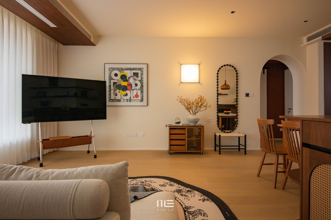 原木的温润、艺术画的跳脱、弧形拱门的雅致,交织成慵懒的居家叙事。当暖光倾泻,白纱轻垂,时光也在此刻慢炖,把都市的喧嚣滤成客厅里的一帧静好,邀你共赴这场关于“家”的质感狂欢。