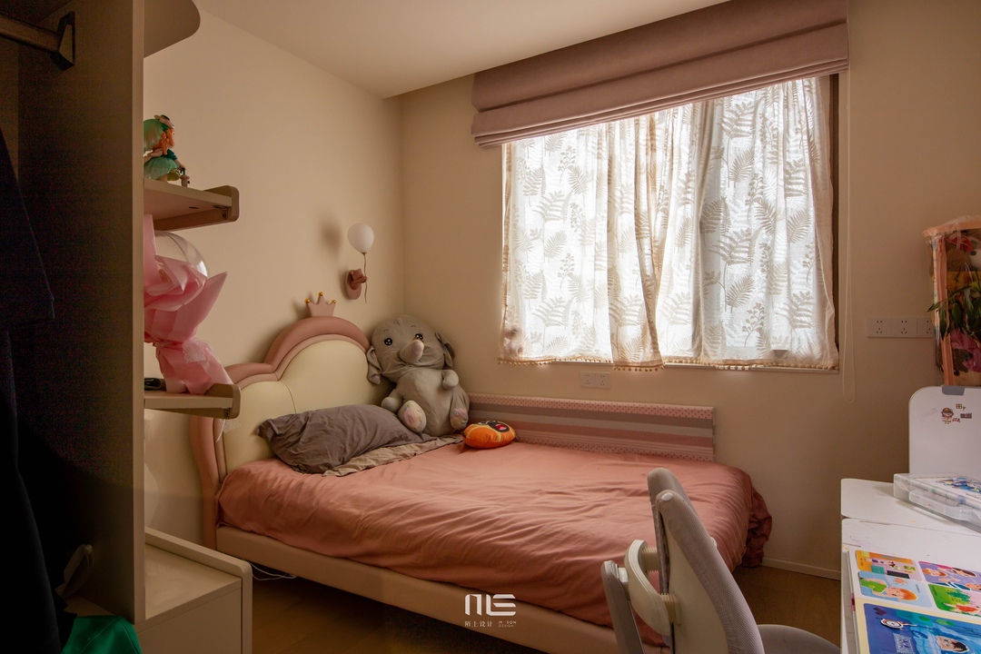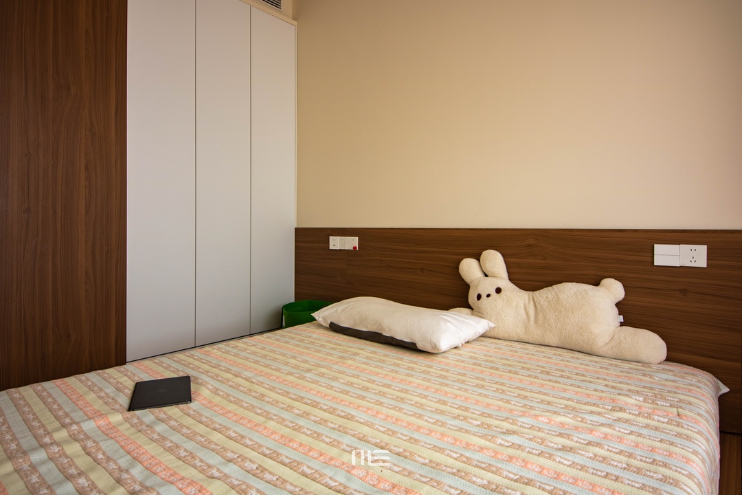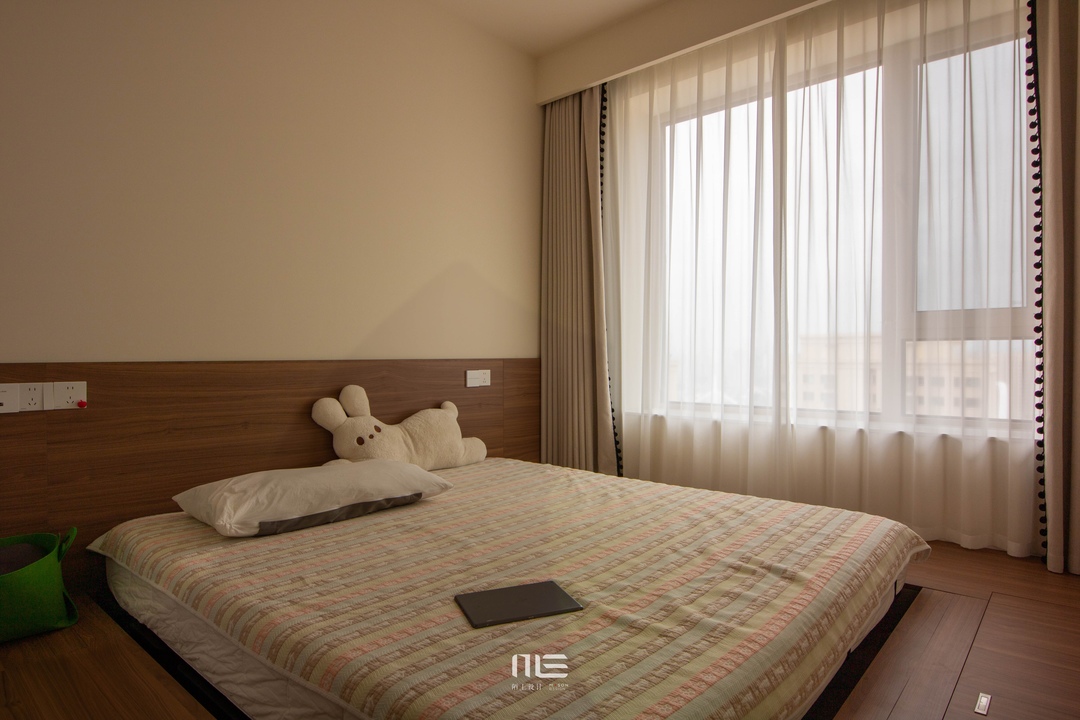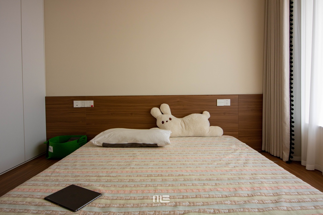 原木铺就的地台延伸至床,把空间酿成慵懒的容器;柔纱窗帘滤过的光,轻轻落在条纹床品上,还有那只软萌的兔子玩偶,把童趣藏进了成人的休憩角落。