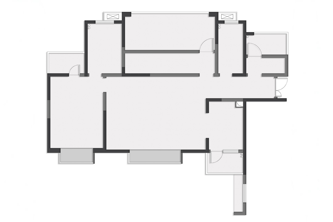 原始结构,除公区和主卧是正常的空间外,其余有可能作为房间的区域都是零碎的,两个狭长过道搭配两个条形阳台,把客厅阻挡得只剩三米多的飘窗单面采光。