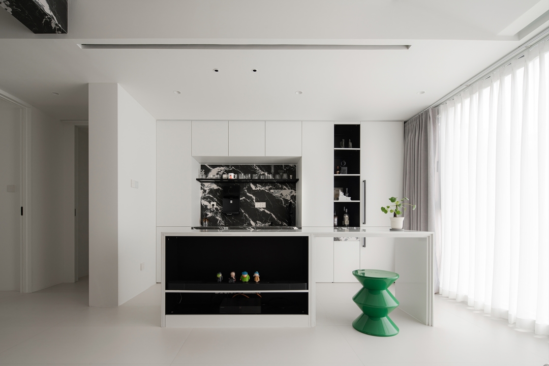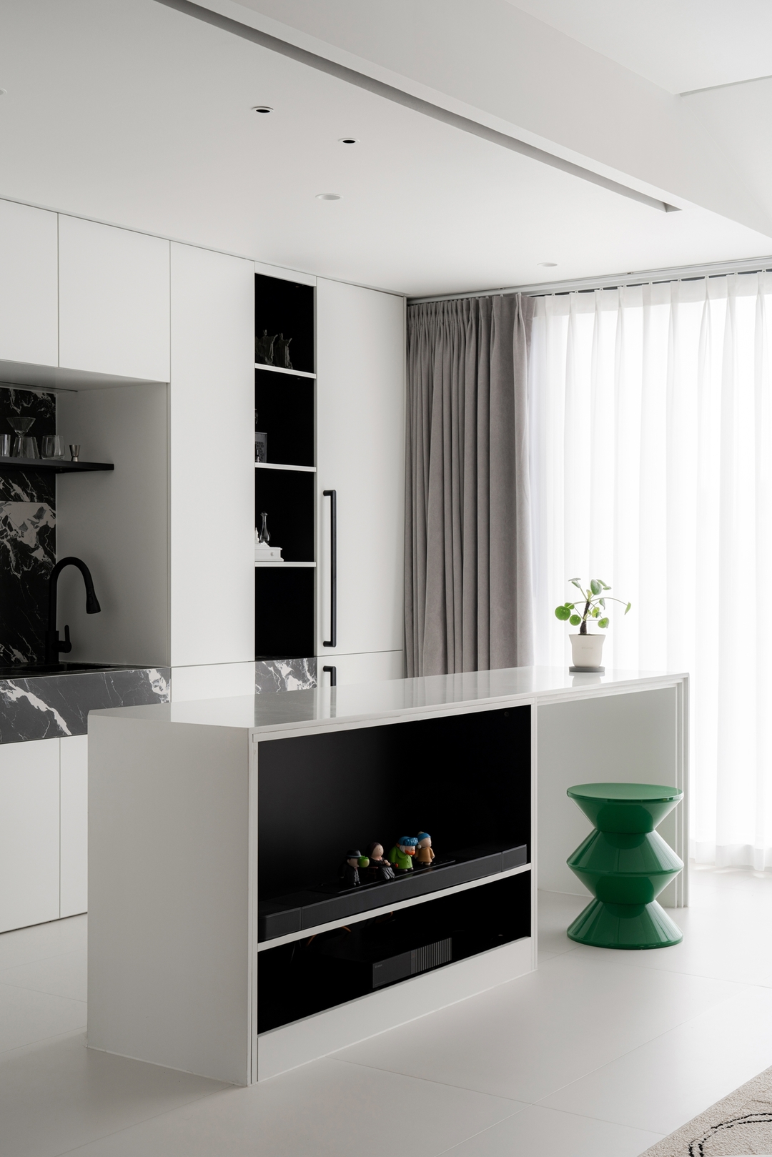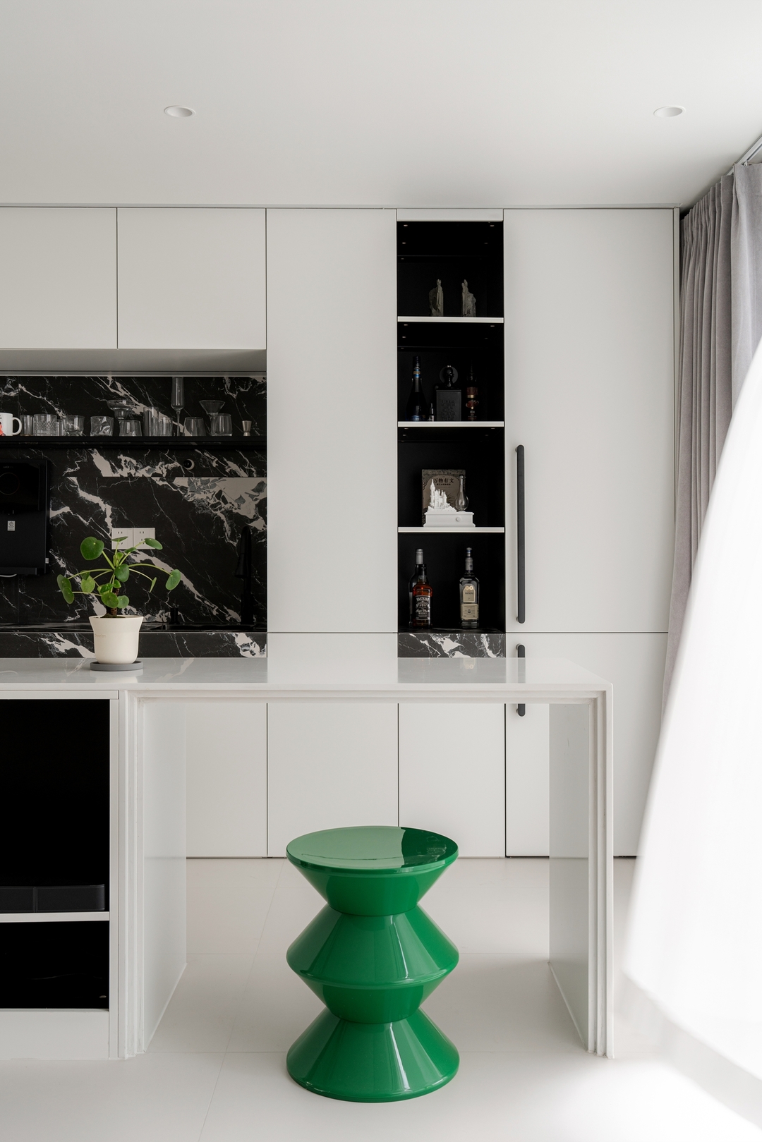 双面操作台置于客厅和茶水吧之间,交互场景更丰富。西厨区的冰箱用来储存水果、冷饮,和中厨的烹饪食材分开收纳,便捷又健康。