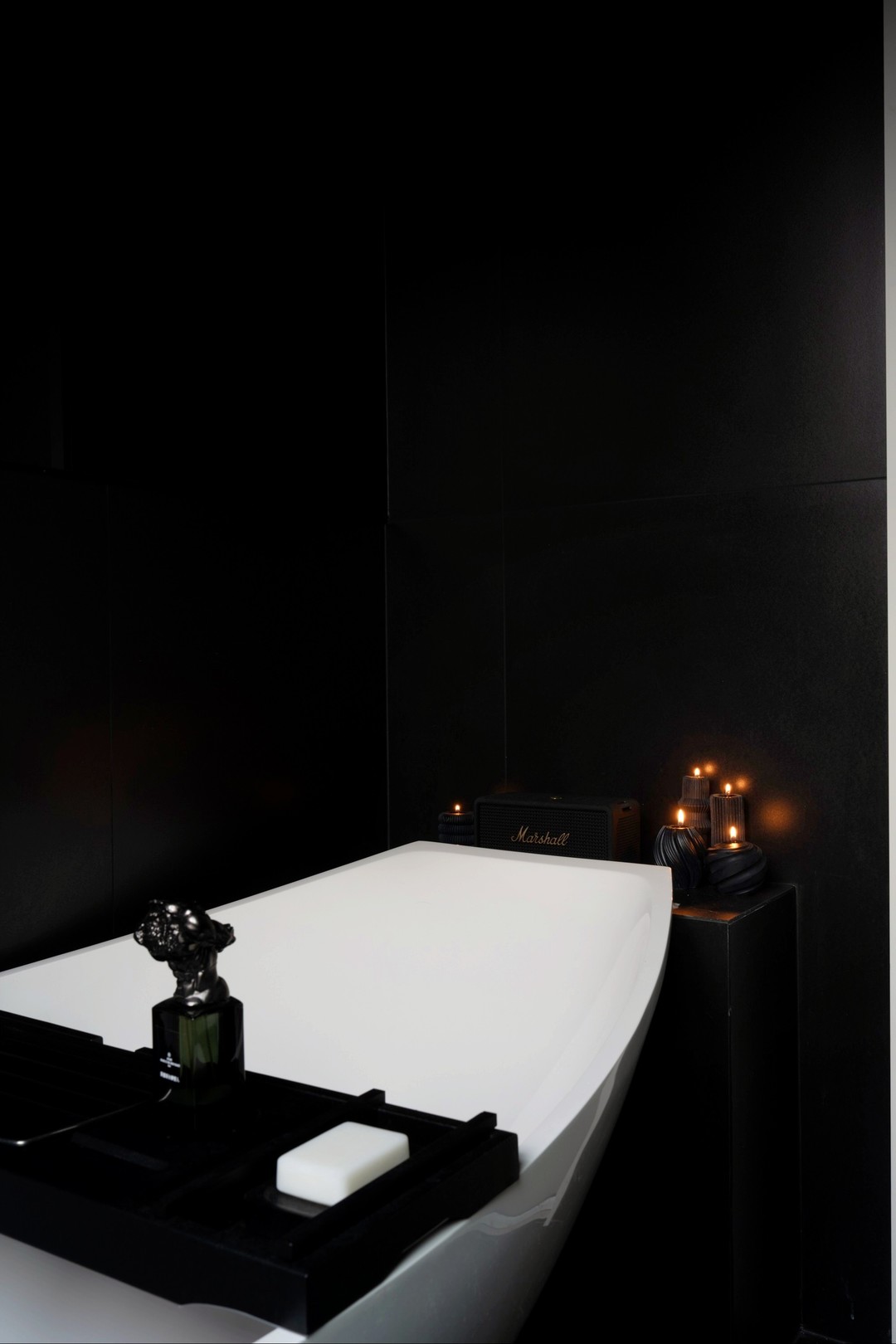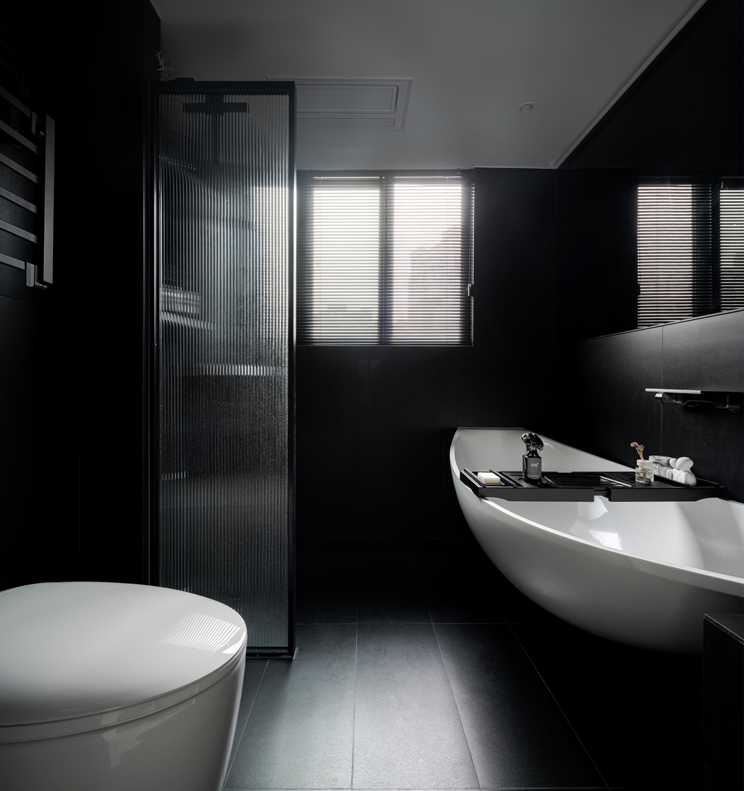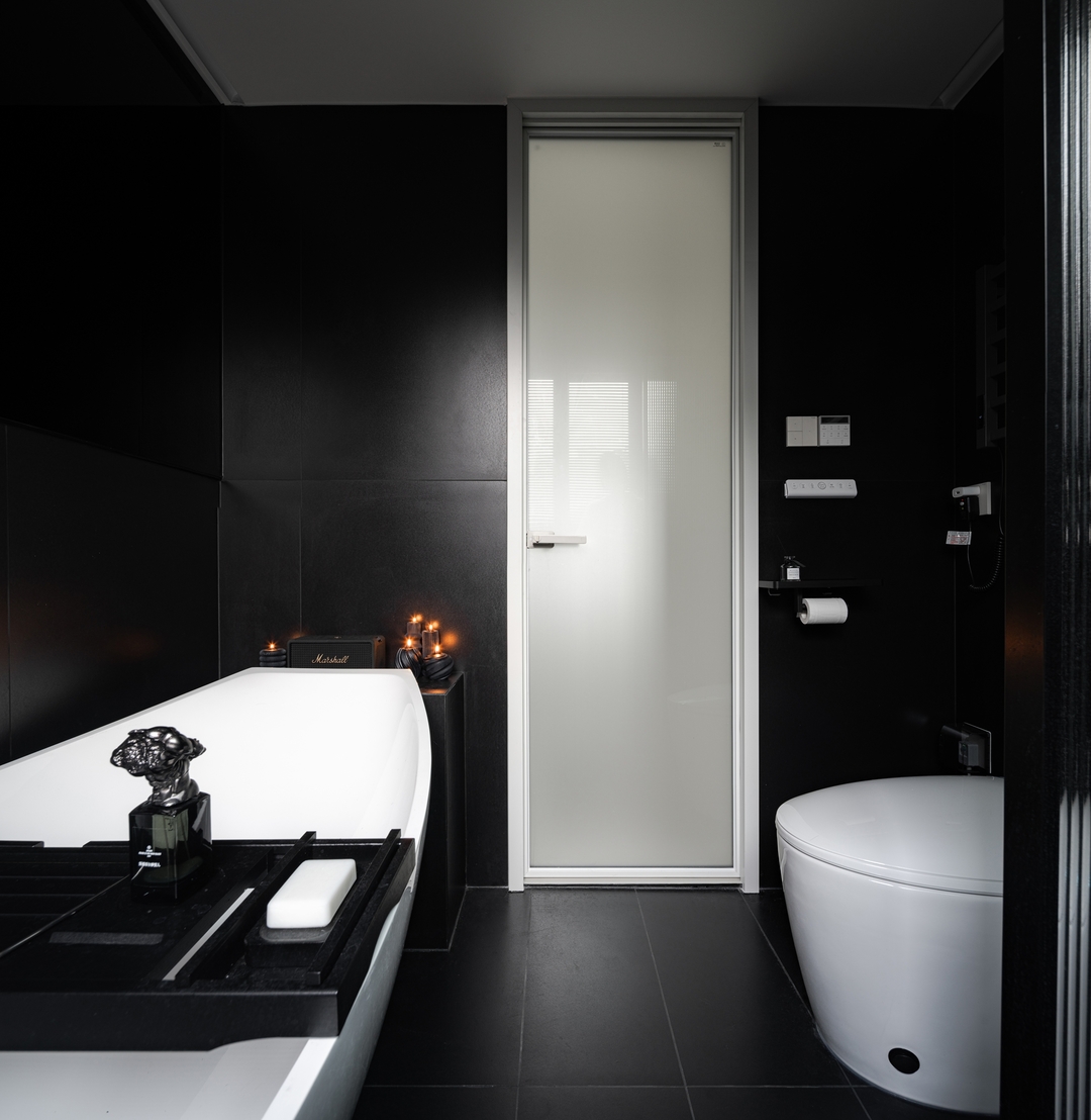 在极简白之外,浴室偏偏来了个翻转,暗黑系的主体搭配白色漂浮浴缸,艺术感与仪式感拉满。