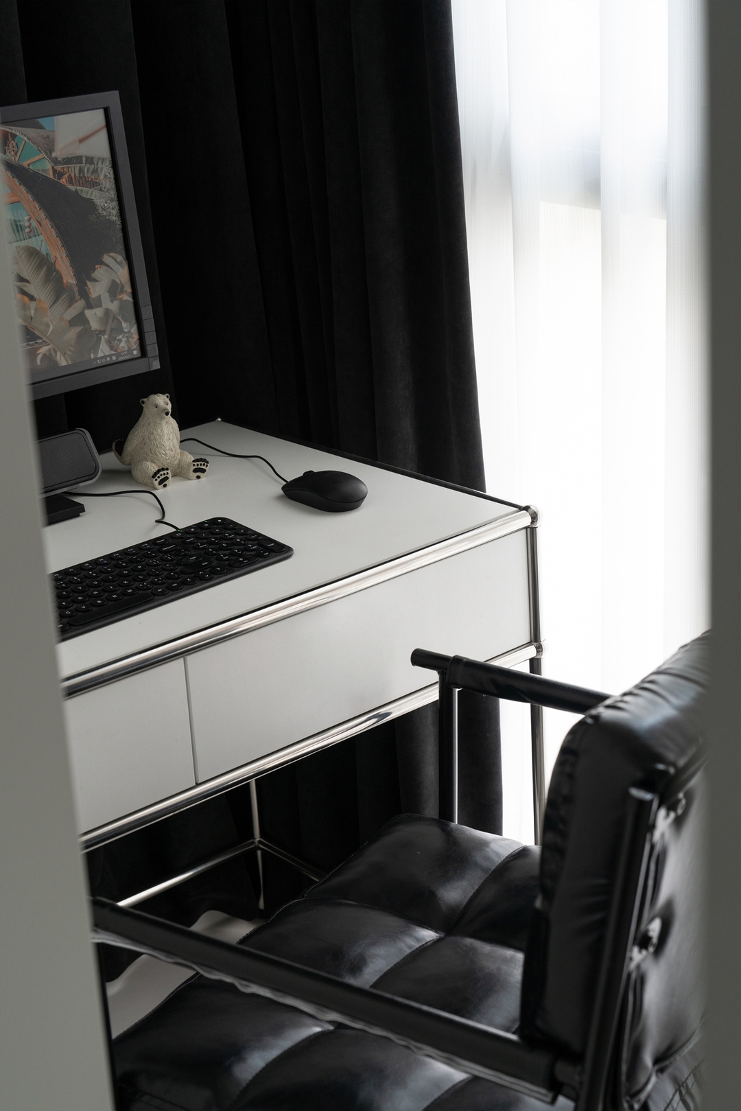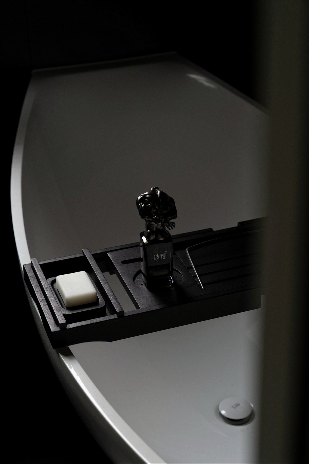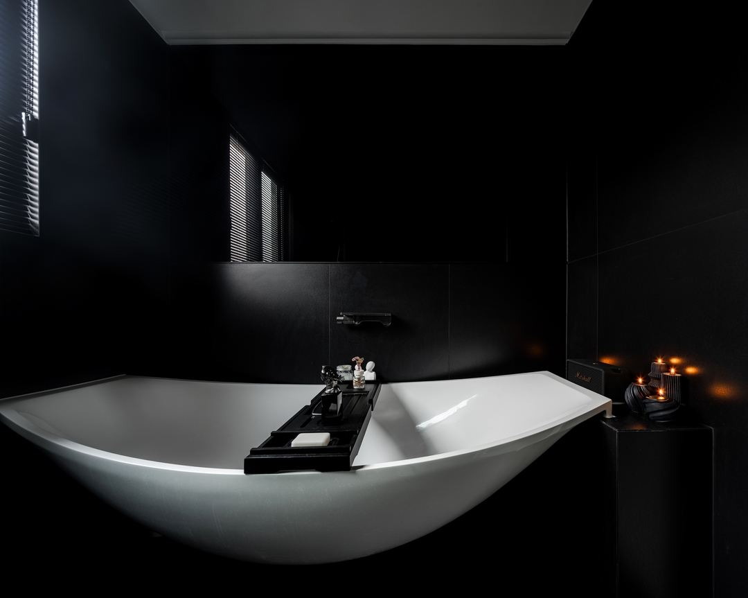 在极简白之外,浴室偏偏来了个翻转,暗黑系的主体搭配白色漂浮浴缸,艺术感与仪式感拉满。