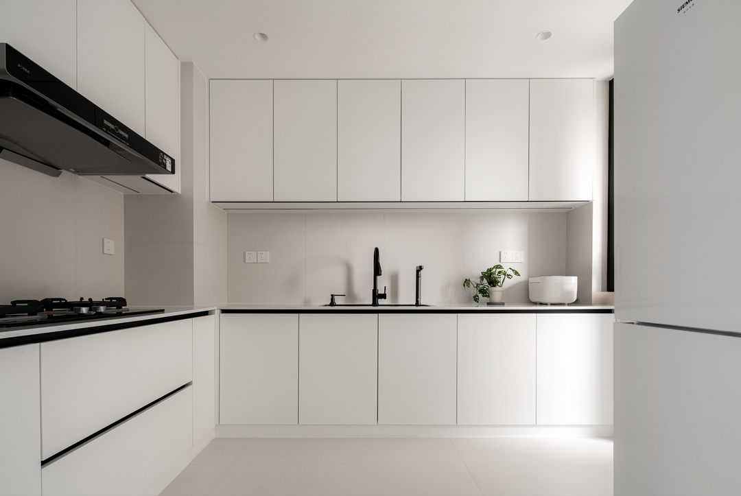 全白厨房带来的极简整洁视觉,为有洁癖的业主创造了享受烹饪的惬意环境。