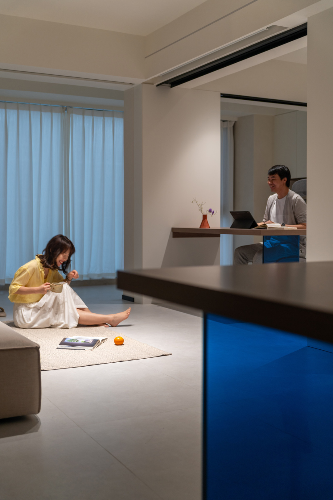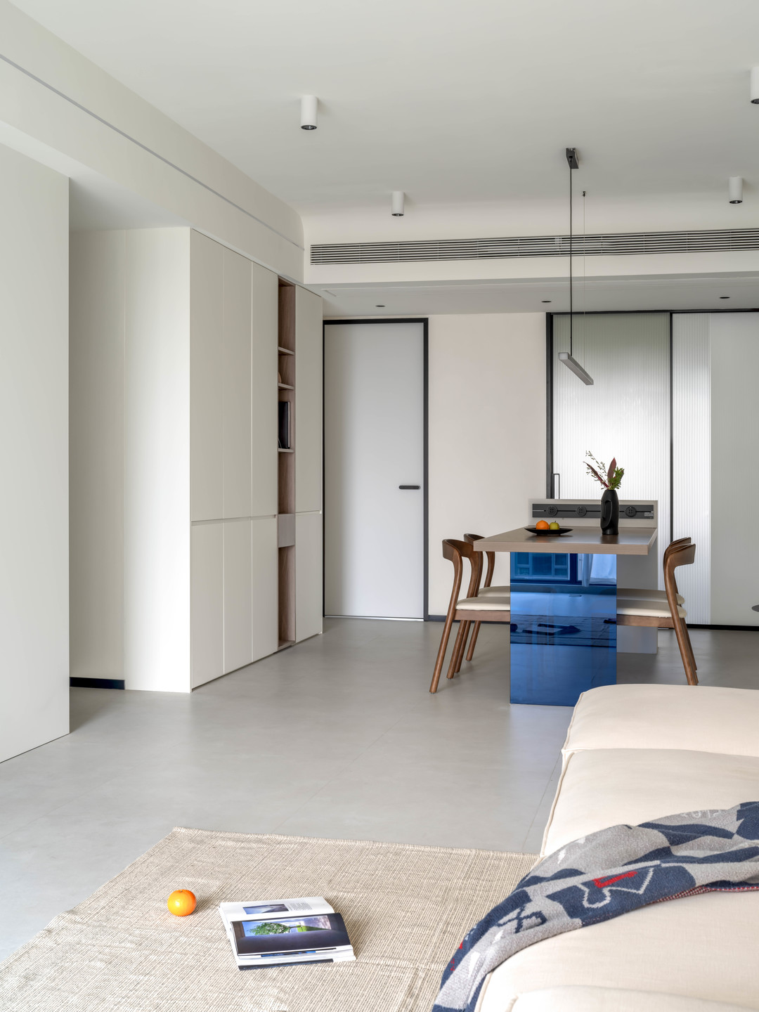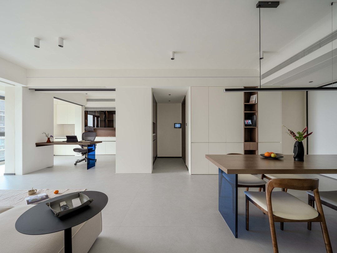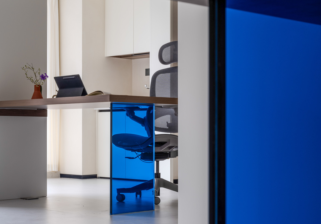 之前一直没有讲到的点是空间中的点缀色“克莱因蓝”,这是男屋主喜欢的颜色,同样把它制作成粹色玻璃桌腿,成为这个空间独特的亮点。