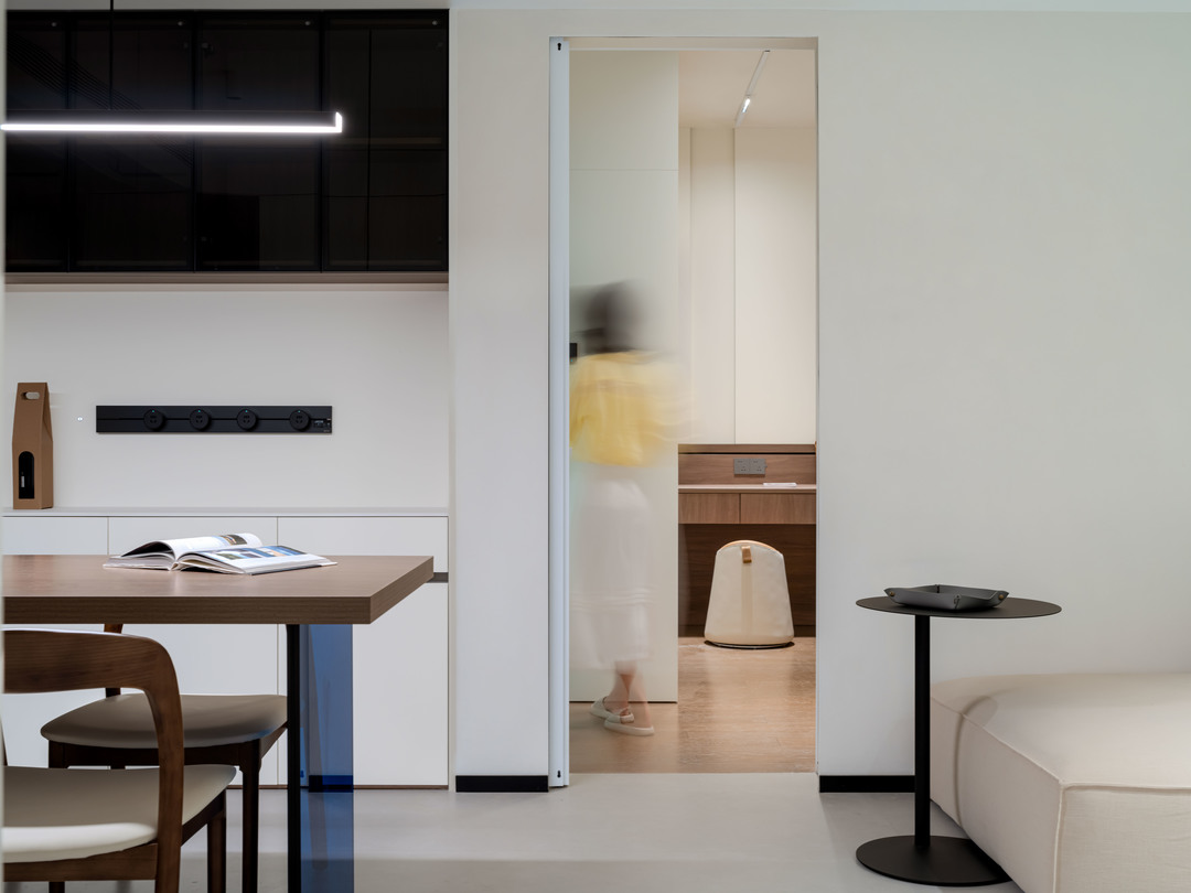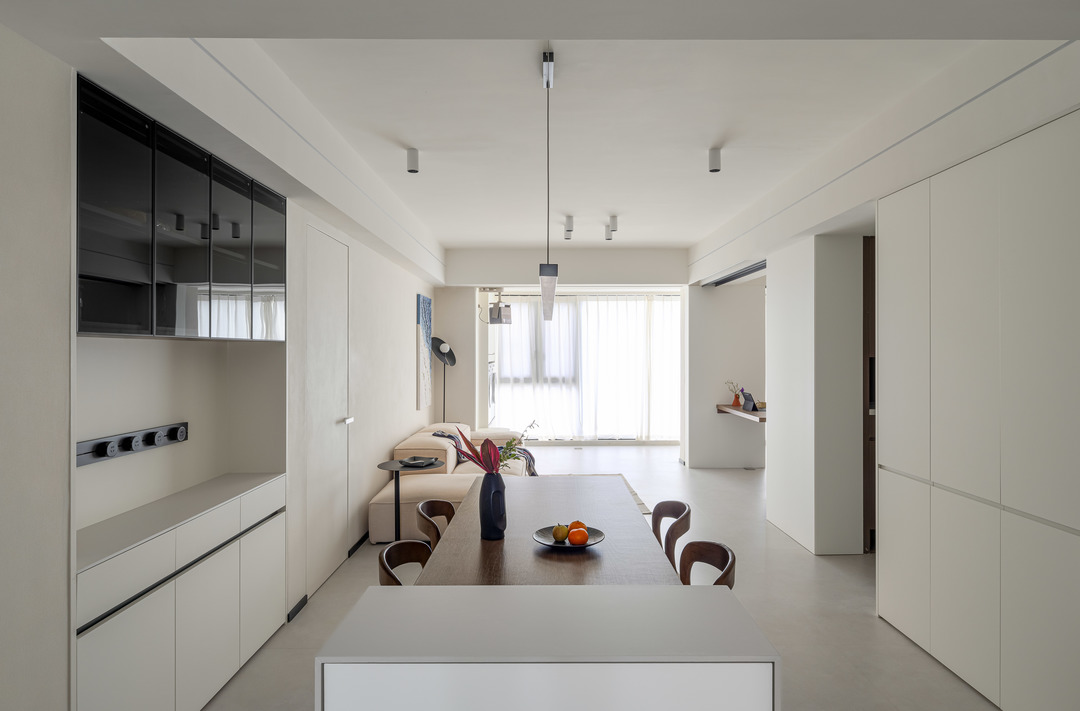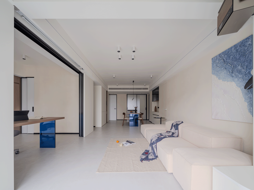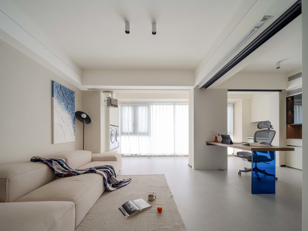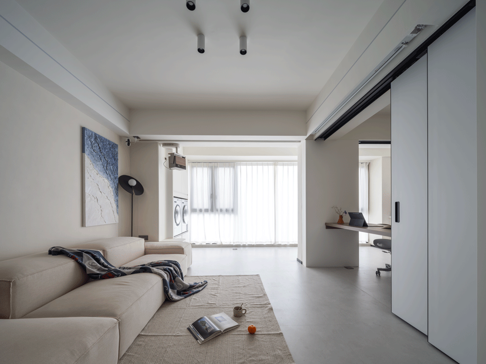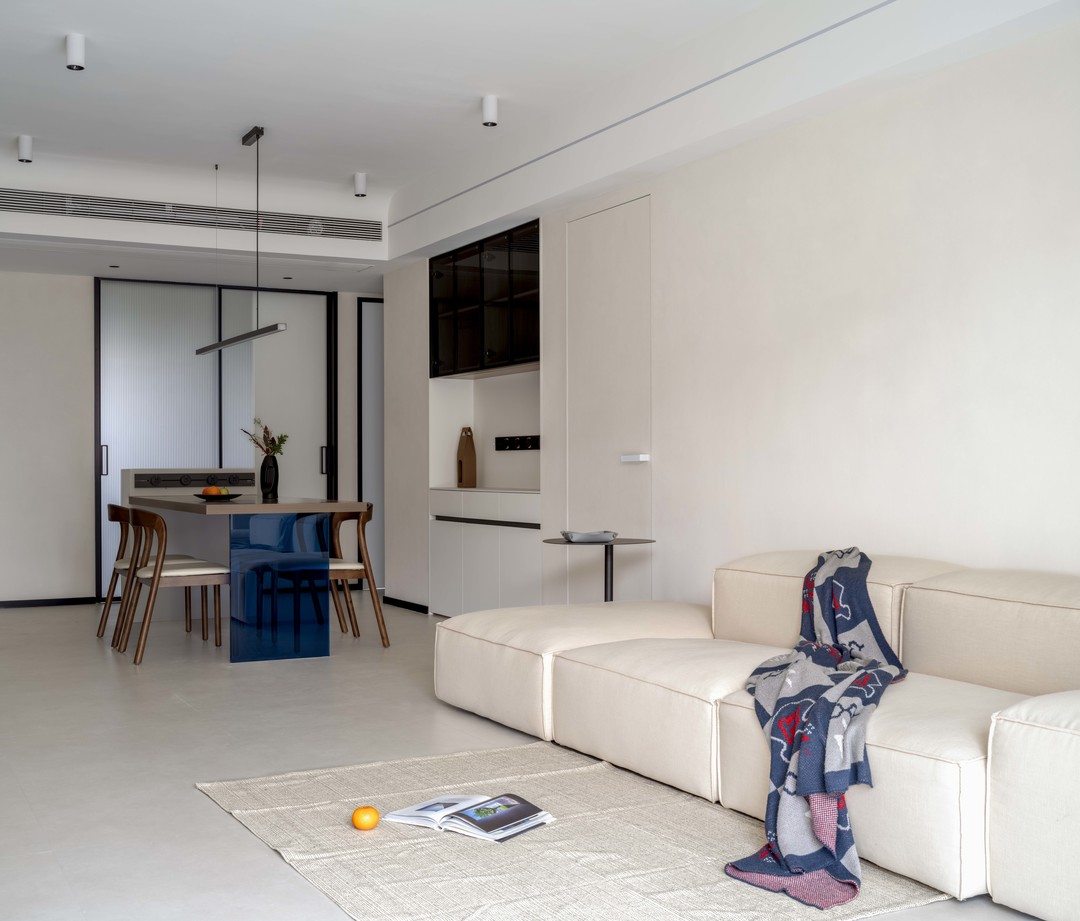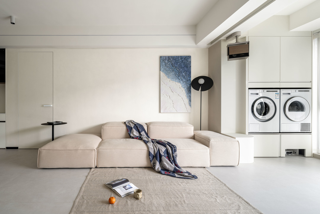 哑光暖白的素色地面,搭配浅米色艺术涂料墙面,最后辅助白色柜体与天花,超极简的配色体系构成了整个客厅的初印象