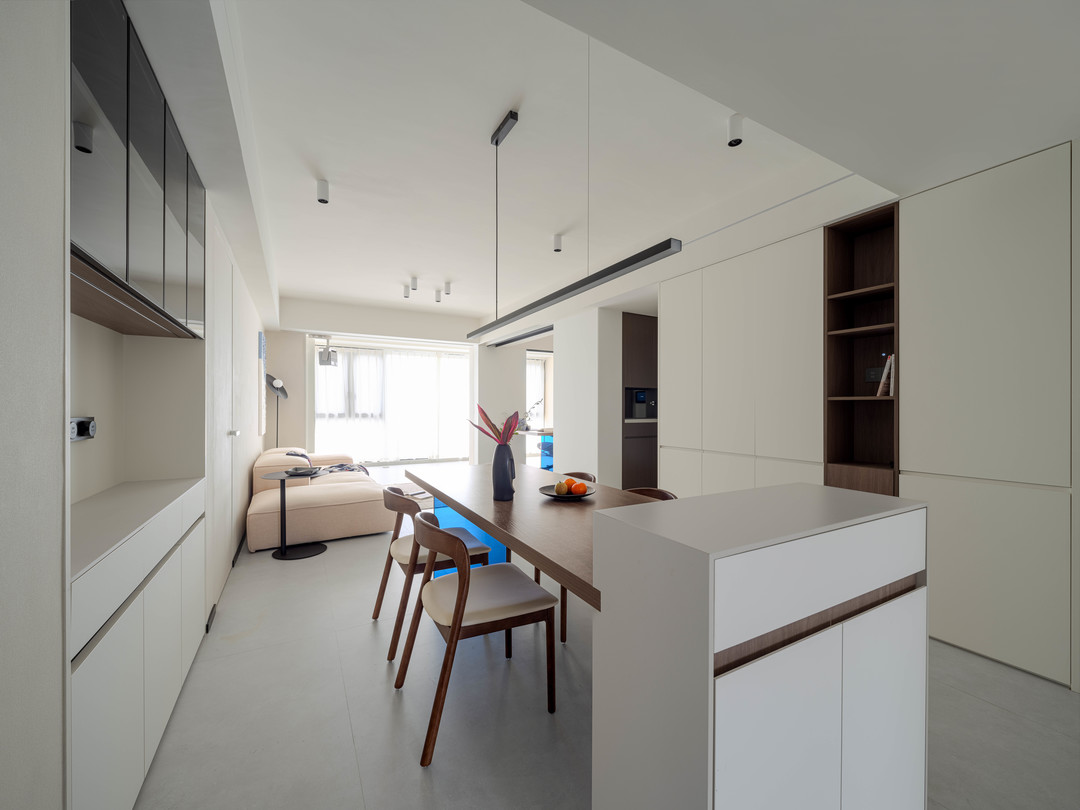 餐桌的另一端有定制一个迷你小吧台,从厨房端过去的菜品可以临时摆放,还可以暗藏线路进去,方便轨道插座安装,平时桌上用一点小电器也不会显得凌乱了。