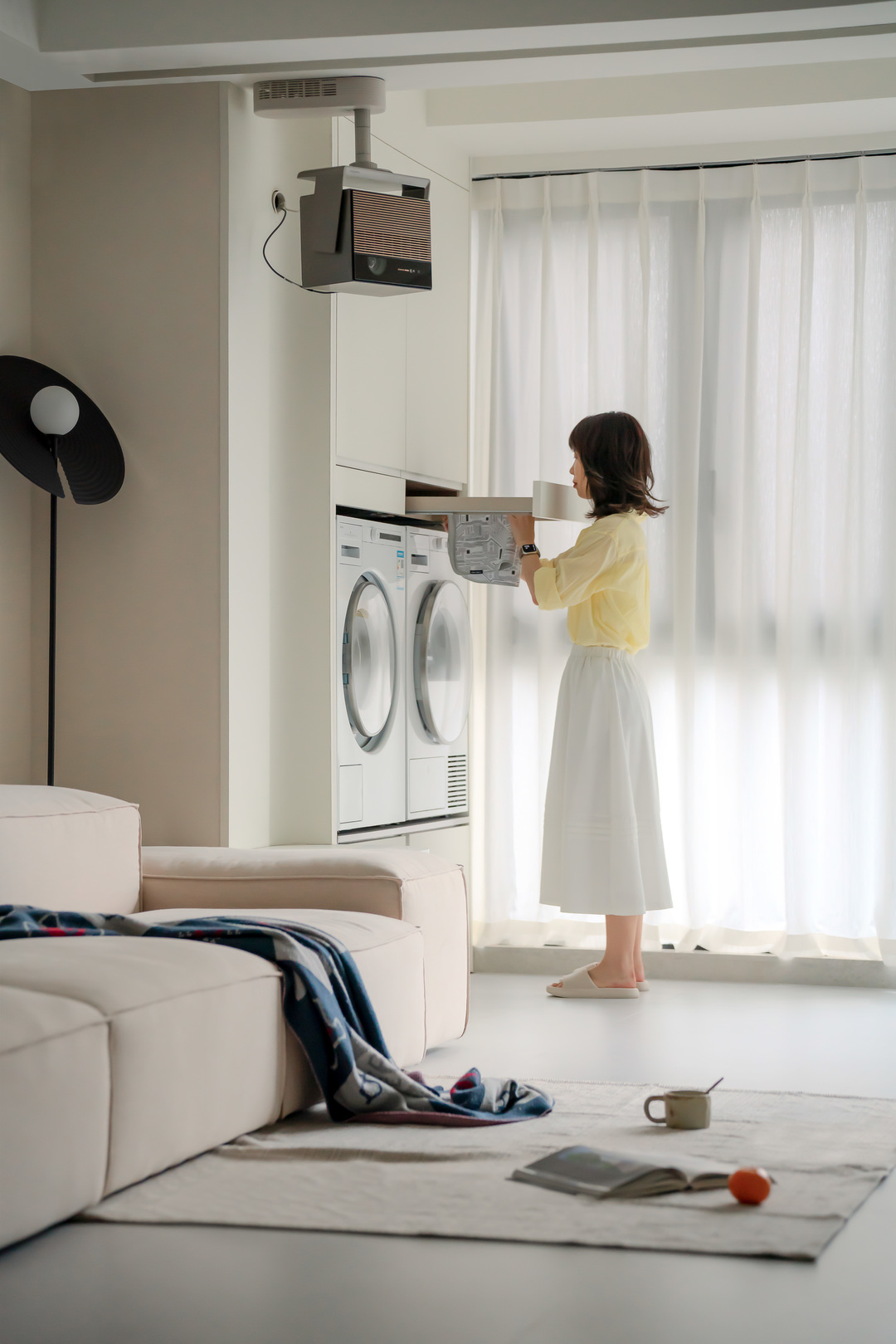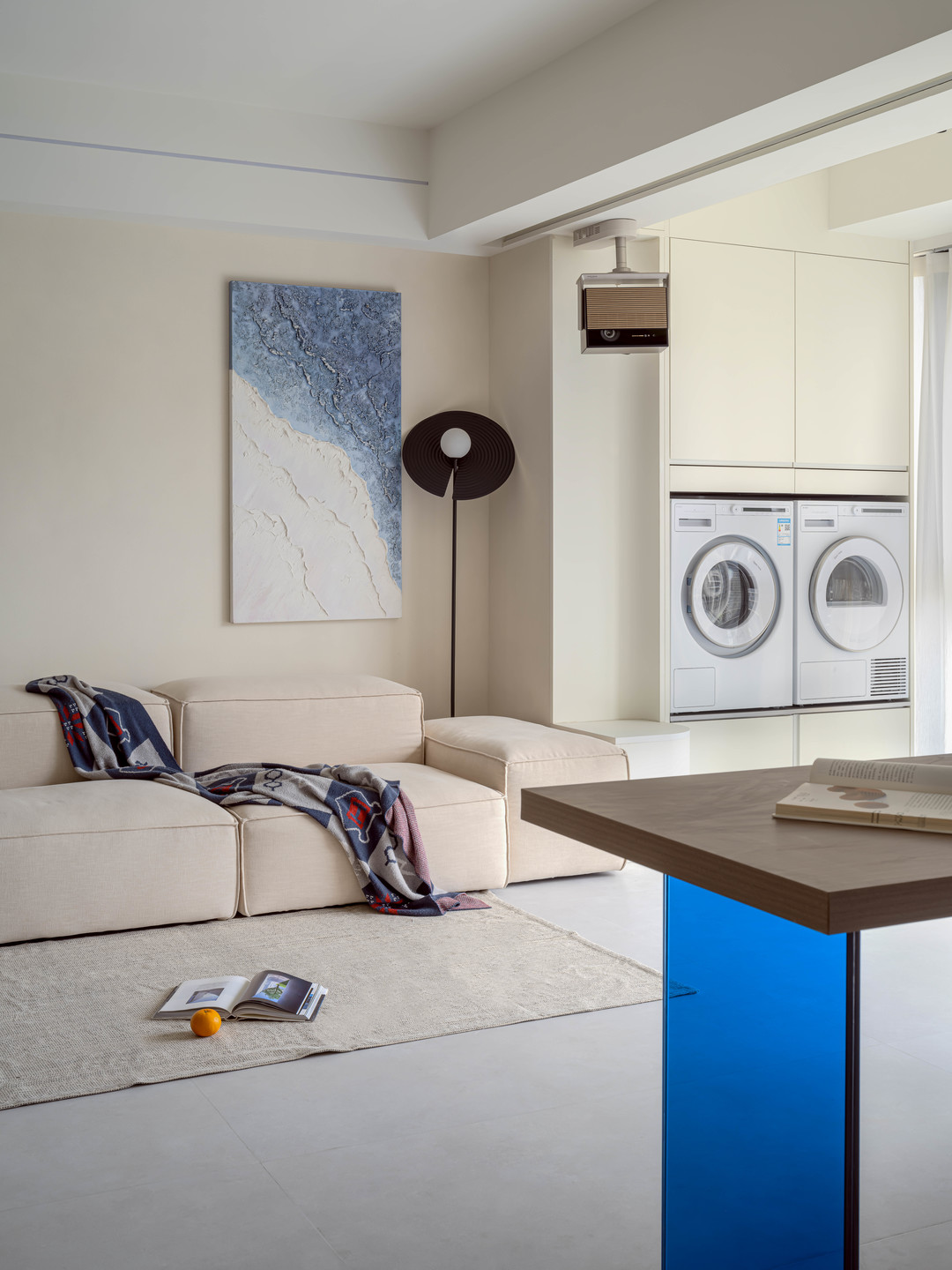 阳台合并后也成为客厅的一部分,但洗衣烘干的作用依旧不能丧失,这里选择全嵌入的洗烘套装,与柜体定制合并一体,达成美观上的和谐。