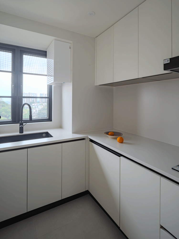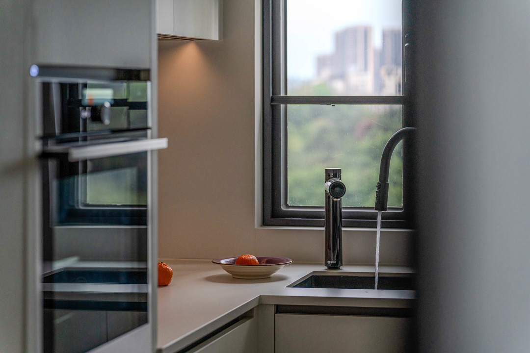厨房空间就常规许多,所有的电器和拉篮全部暗藏处理,多余的棱角和把手都隐藏起来,让厨房外观看起来更加简洁大方。
