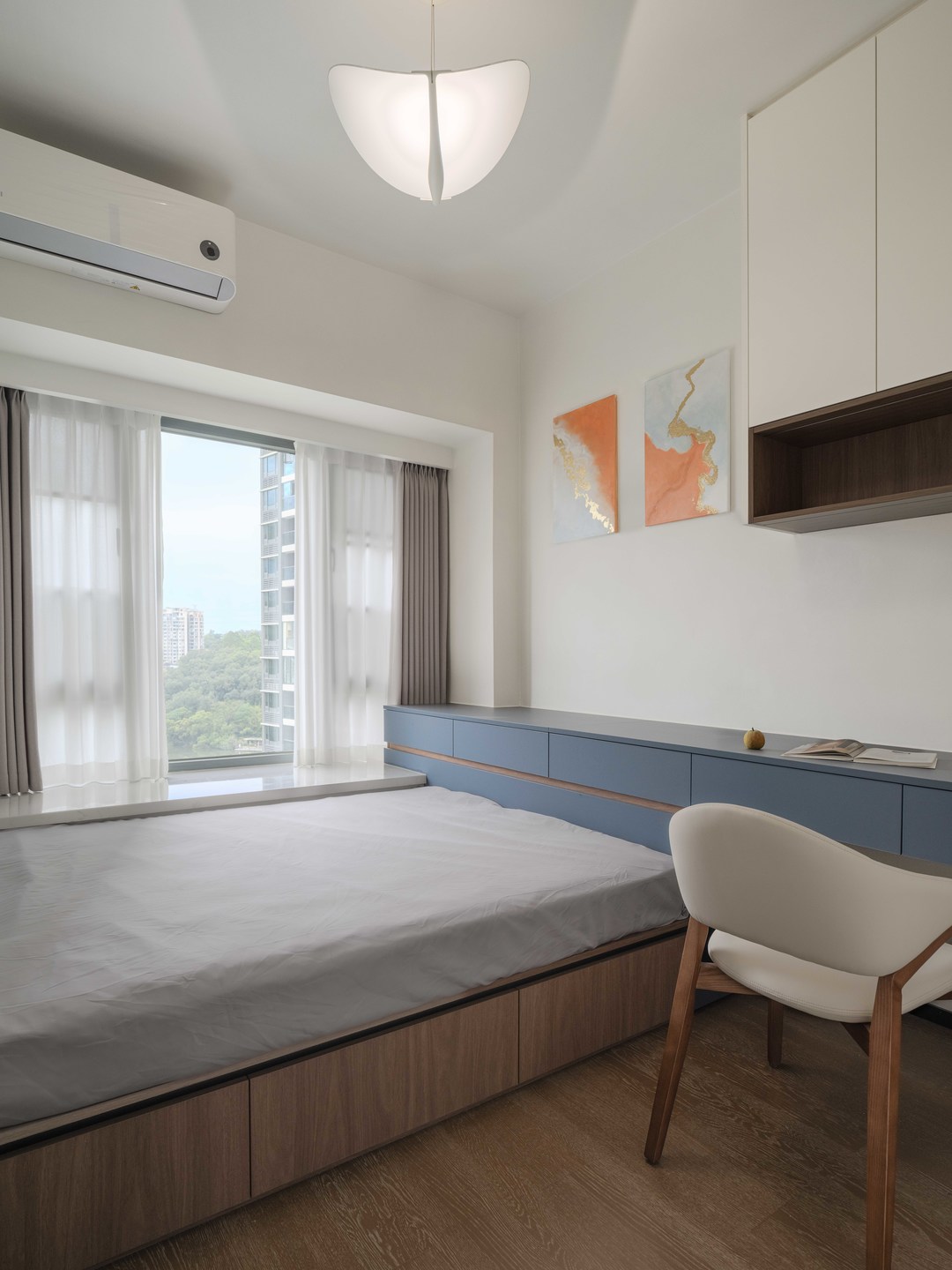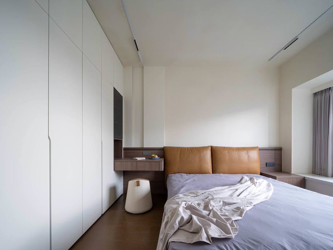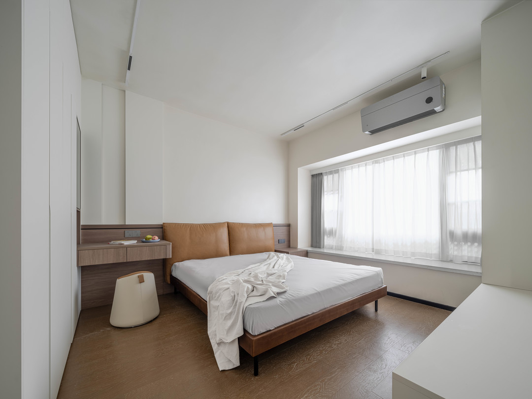 主卧室的整体风格就收敛了许多,因为精装木地板没有拆除,所以只需要添置床品和衣柜即可,属于改造中比较节约的空间。