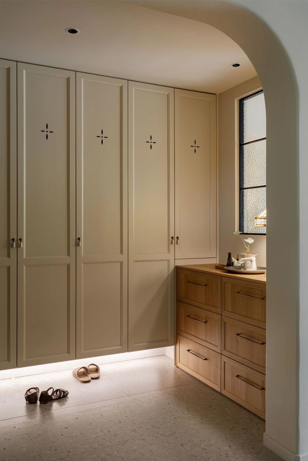 到顶柜体给到了这个家的收纳储物满满的安全感,下方留空位置增加灯带设计不仅方便日常换鞋,也能提升空间整体的温馨氛围。