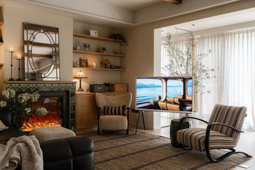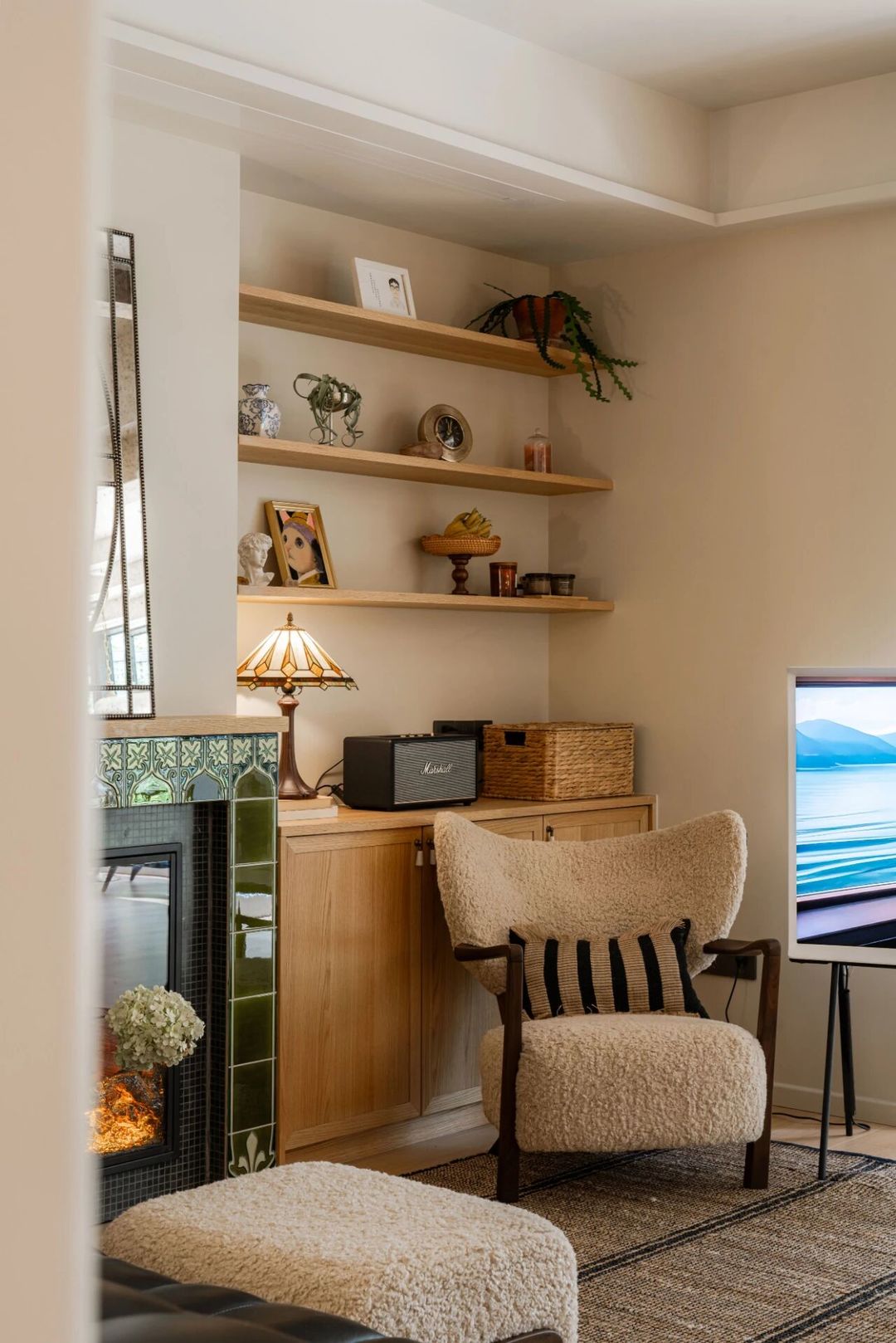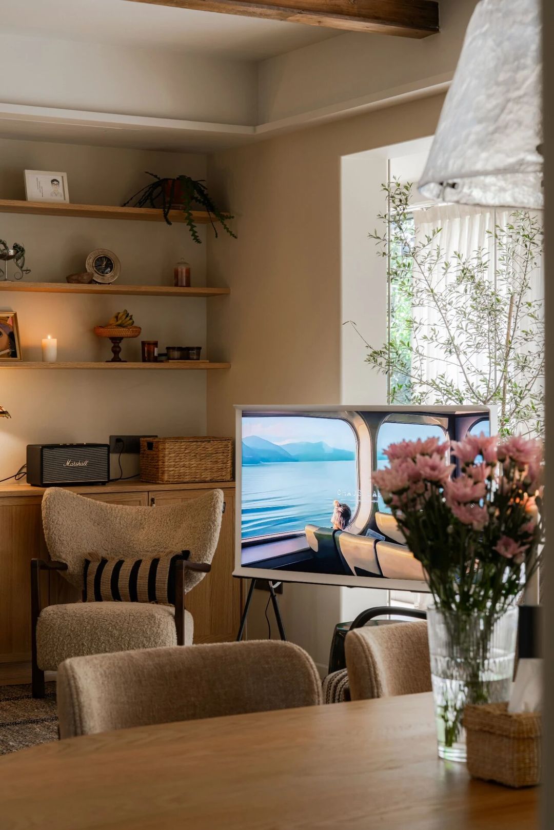 从餐厅看向客厅。客厅引入了可移动式家具系统,单人沙发椅、可移动式电视……使得空间不再是被“家具限定”的结构,而是具备了随需而动的弹性能力。
