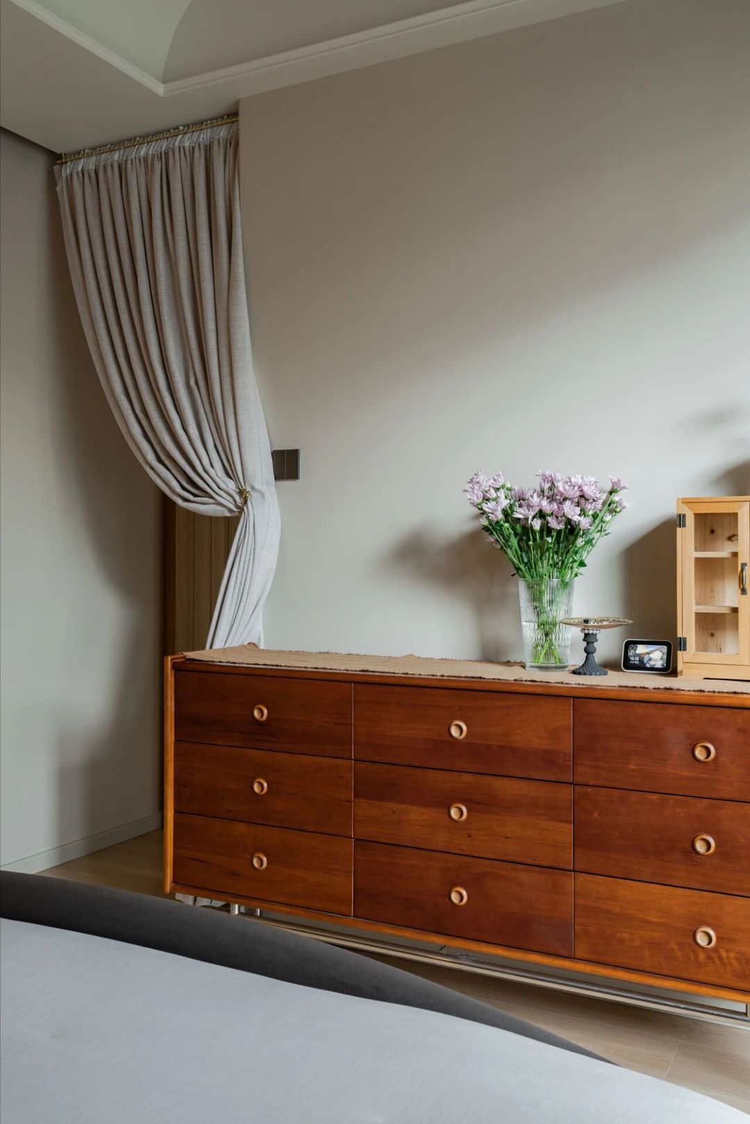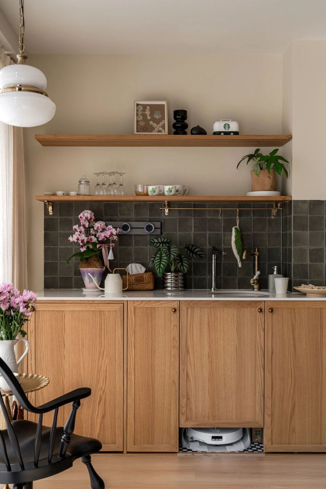 植物花草的引入、色调柔和的家具、各色各样的花器、自然的光线,通过回归自然材质、突出肌理变化、强化手作质感,将精装房从千篇一律的框架中解放出来。