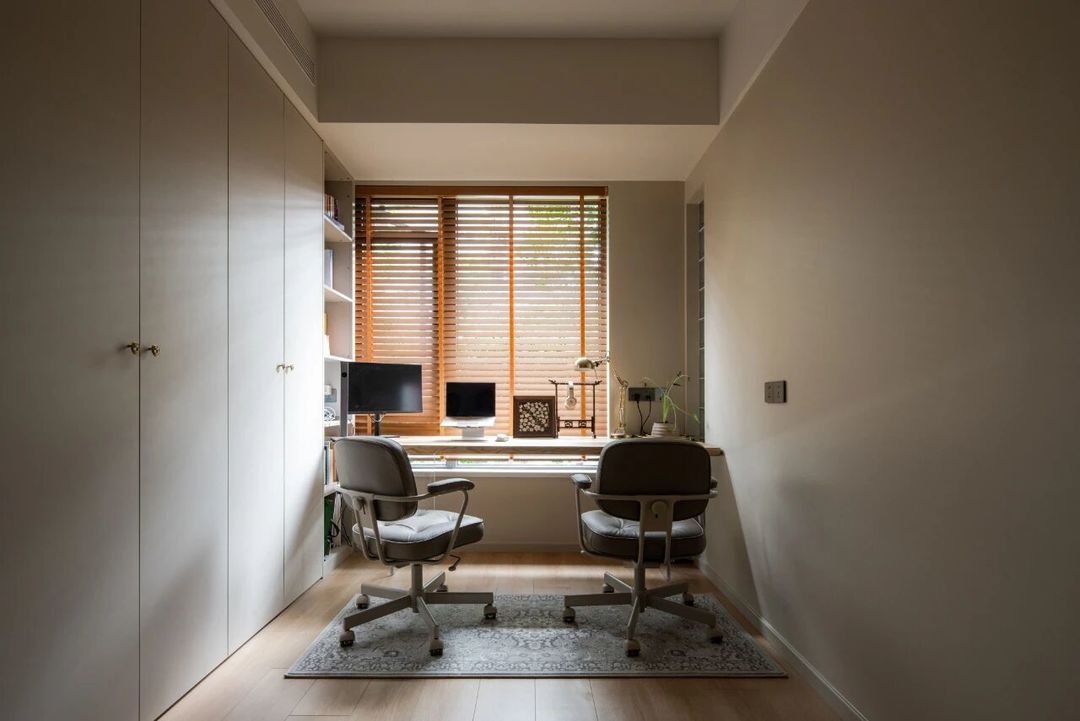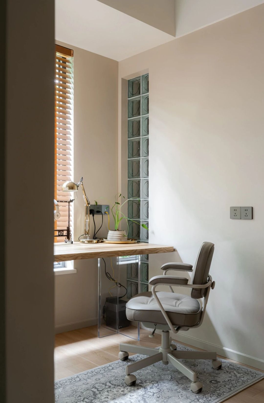 视线朝左转便能看到书房空间啦~左侧到顶的柜体与开放格的结合给了这个空间很多的收纳可能。