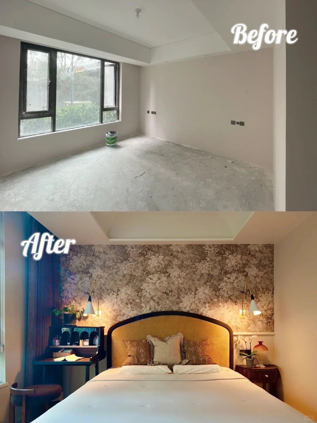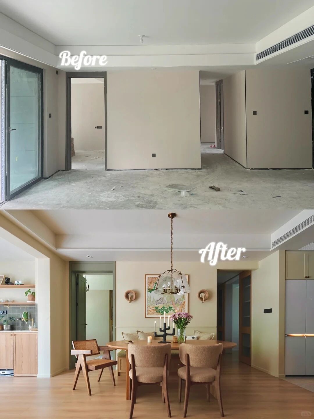 还是对比图来一张~原始的精装交付往往带有统一的标准化痕迹,色彩冷淡,缺乏个性与温度。在本次设计中,整体思路是通过材料的重置与软装的调和,让空间从理性转向感性,从冰冷转向温润,最终营造出一个可安放日常的自然居所。