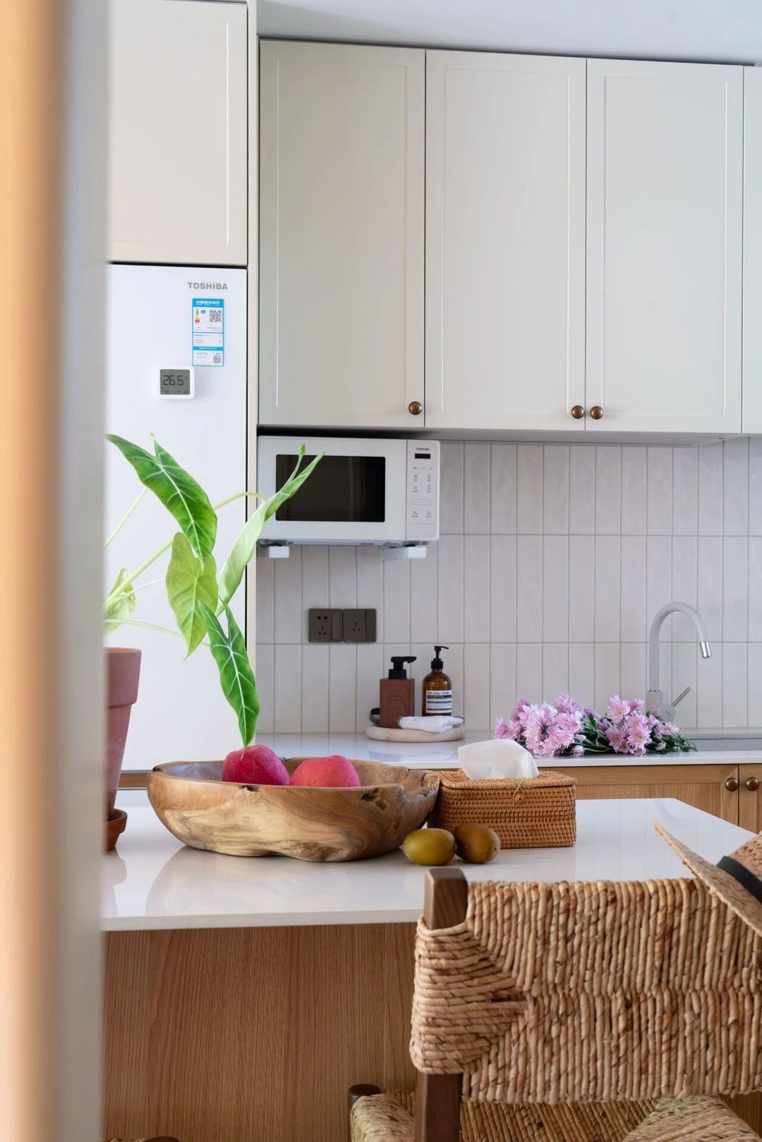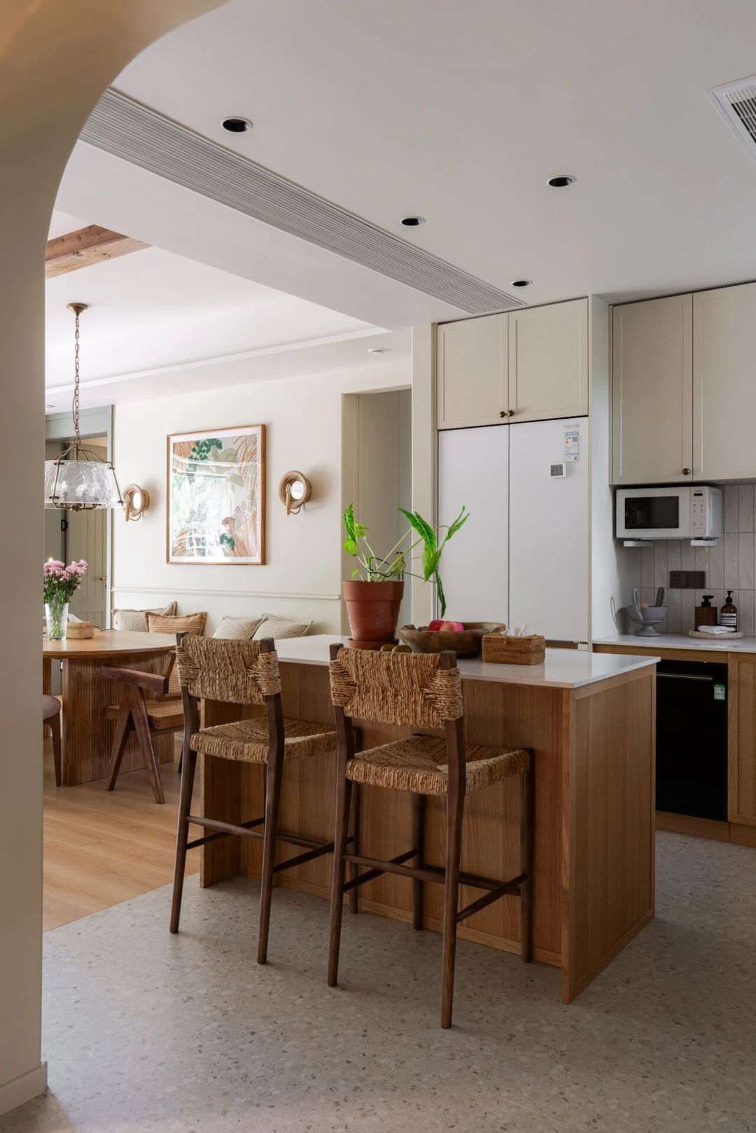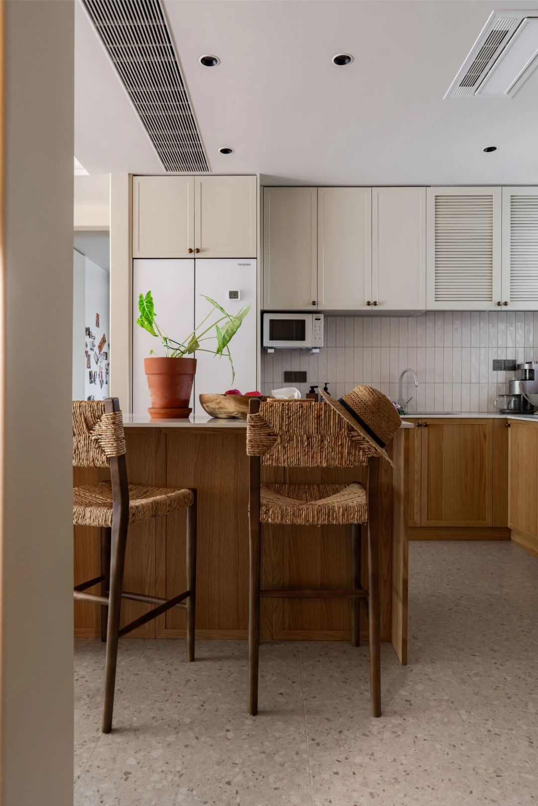 厨房扩开后,增设岛台作为早餐台,搭配天然草编质感的吧椅,从各种材质细节中贴合松弛自然的设计主调。
