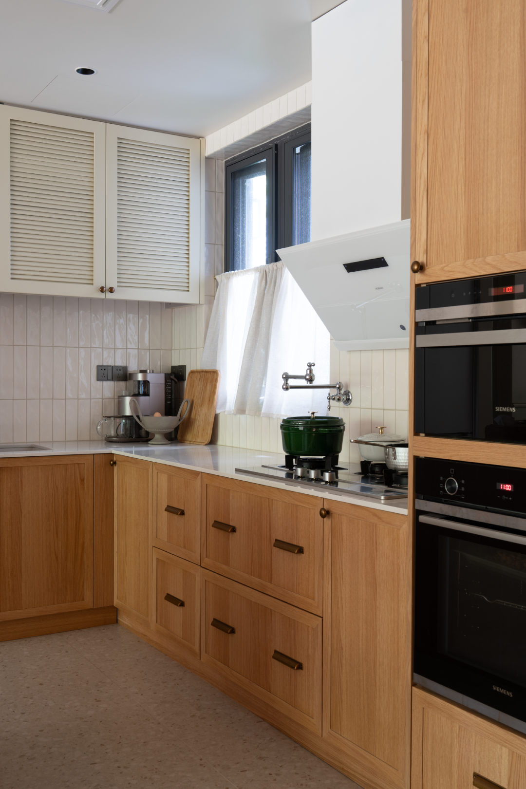 2?? 将厨房打开扩大,设计为开放式厨房。开放格局能让自然光和人工光源更自由地在空间流动,减少暗角;同时使得厨房与餐厅、客厅之间的动线更短,使用上更便利。
