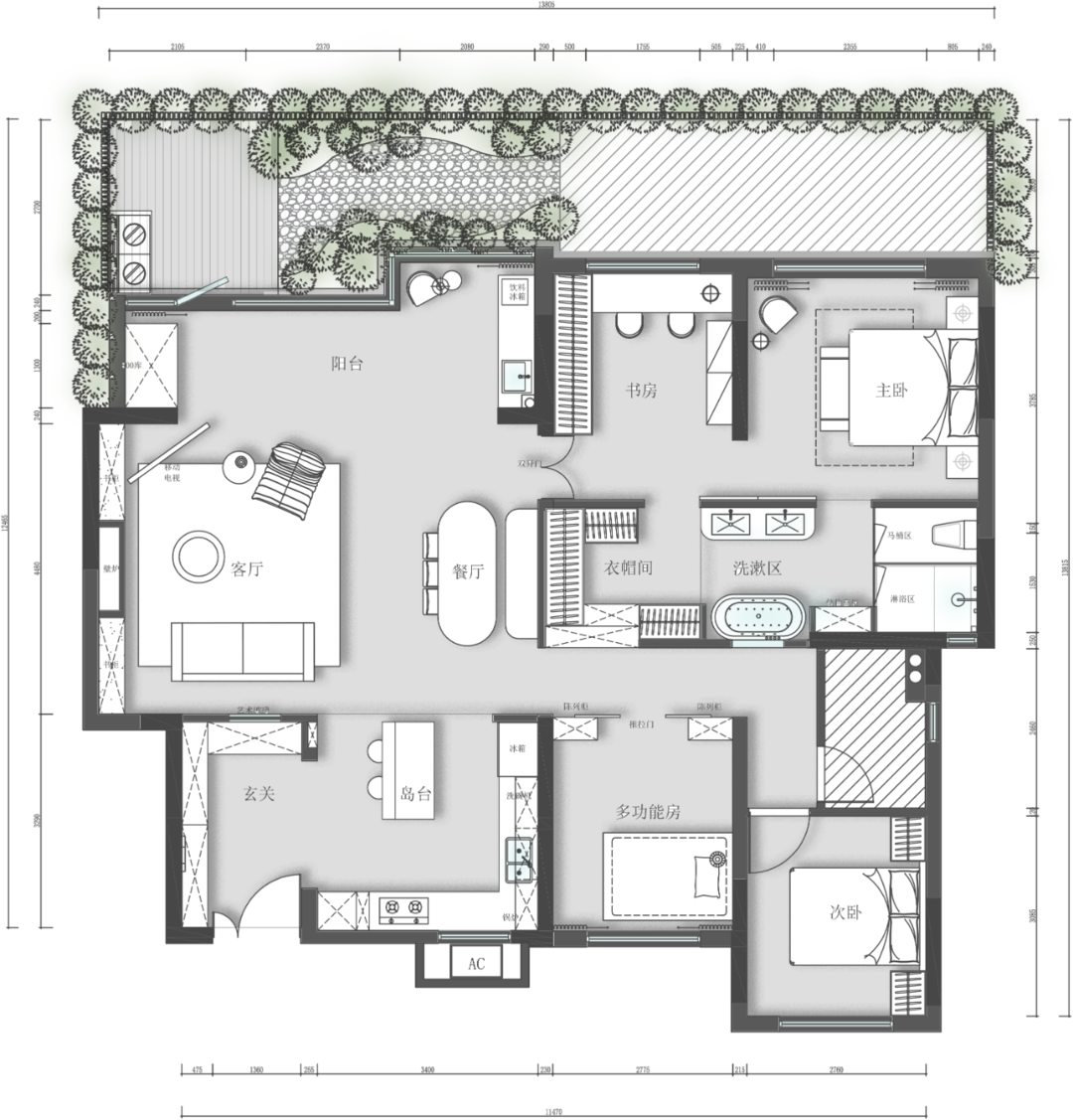 2?? 目前只有两人居住,希望公区和私区划分更清晰,将主卧作为大套房形式,有可以做牛马加班的书房,可以泡澡的浴缸,有互不影响的双台盆洗漱区,当然还要有大大的衣帽间。