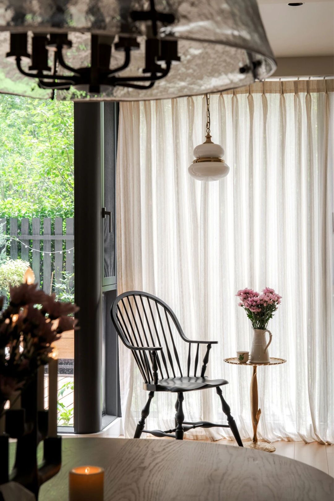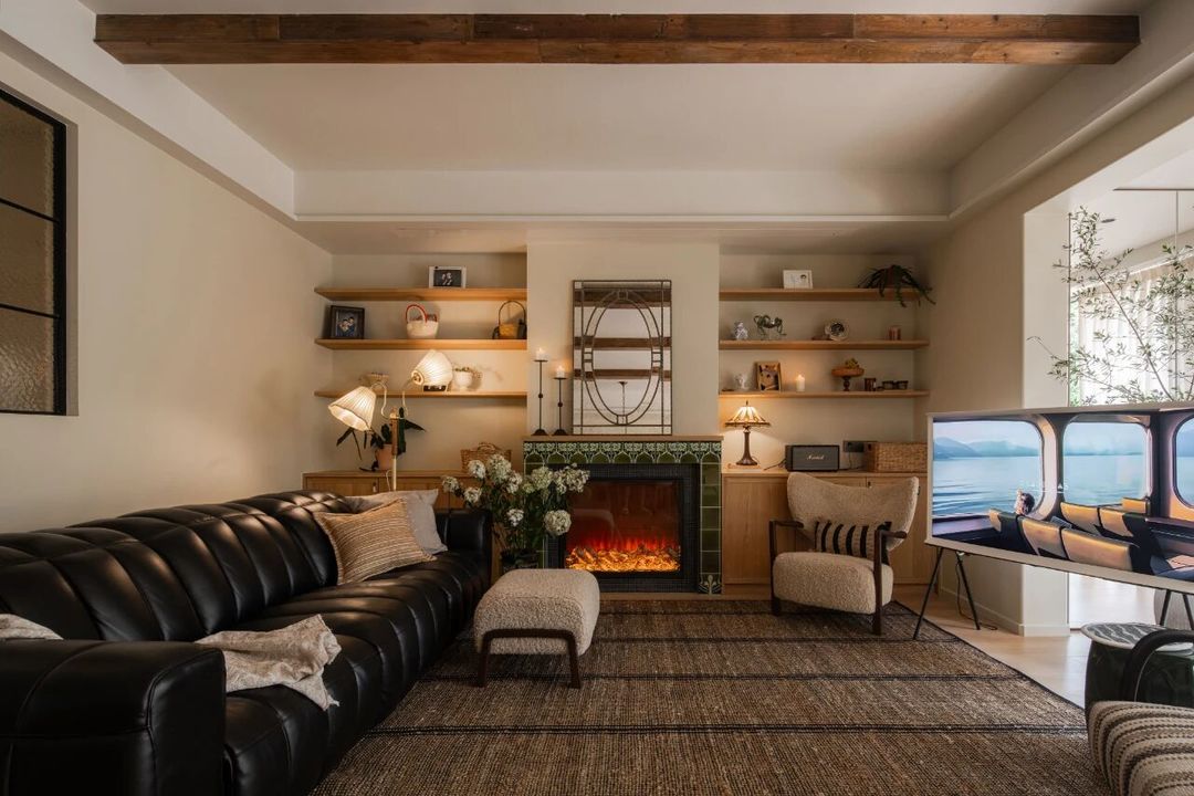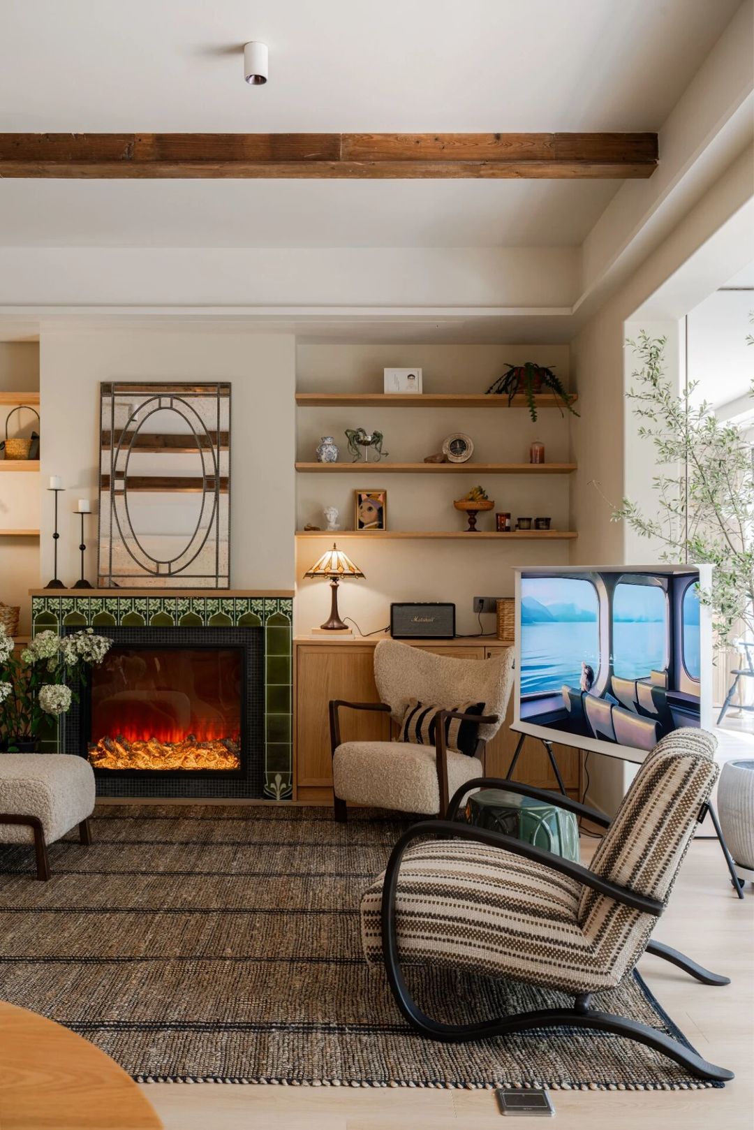 仿真壁炉是空间的情绪魔法师,它不发热却可以让人心里暖暖的。跳动的火光让围坐四周的人们形亲密的围合感,赋予空间仪式感和归属感。黑色沙发是业主上个家的旧物,虽然微亮且大面的精致黑色皮革,和我们质朴自然的空间略有冲突。但从设计之初为了能够让它更好的融入,特意在地毯和玄关的透光窗格上出现的局部黑色元素,最后呈现出了很好的融合效果。