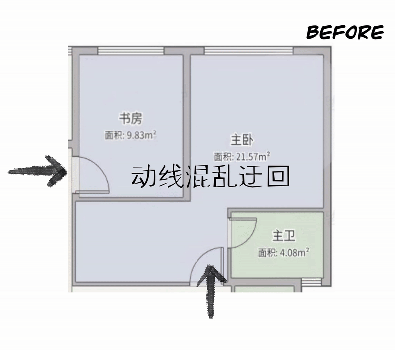 本案重点改造空间——豪华的主卧套间!通过砸墙、调整门洞、重构动线一系列操作,最后呈现了一个完美的洄游路径套房。