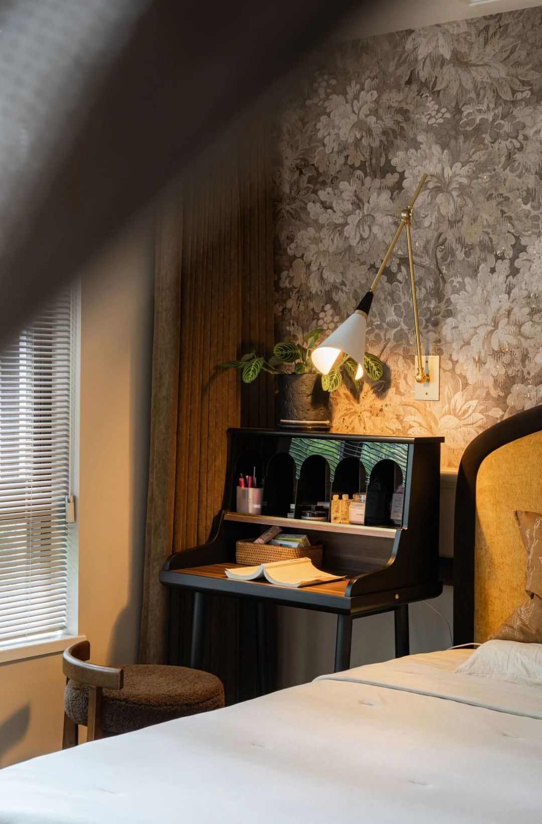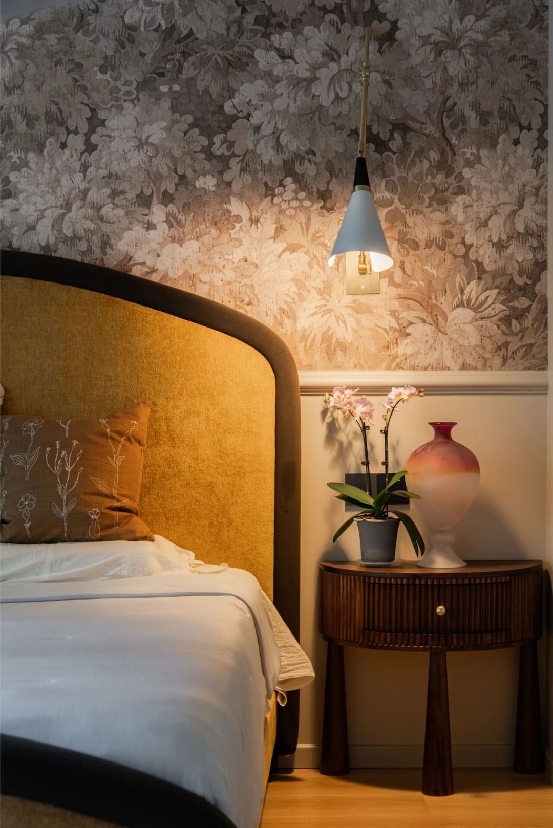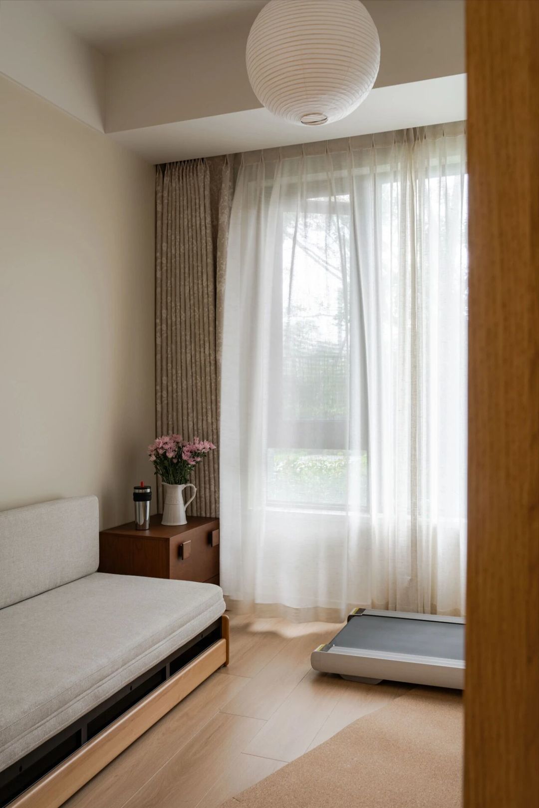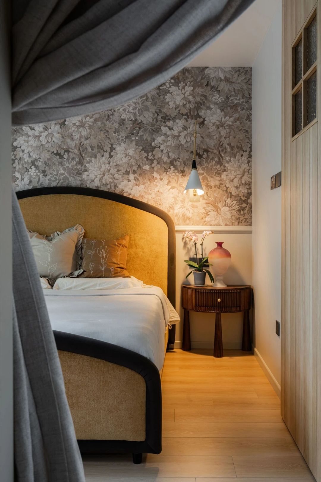 主卧休息区与书房用布帘进行一个软隔断。卧室休息区墙面选择了大花色的墙纸,营造了空间层次感,同时也强调了整体的自然氛围,更具生命力。