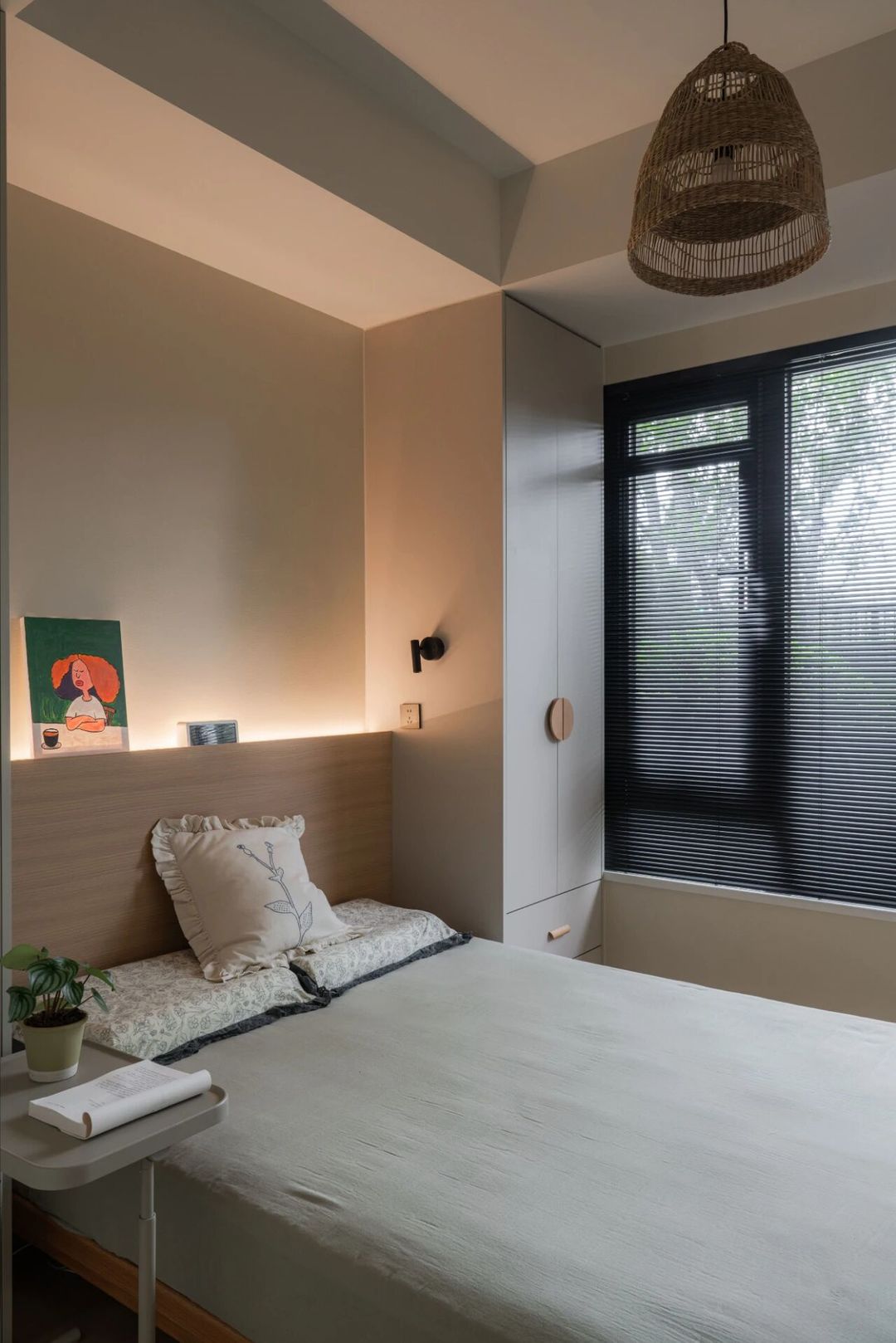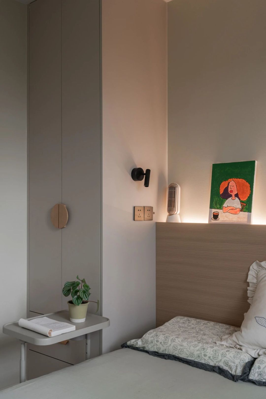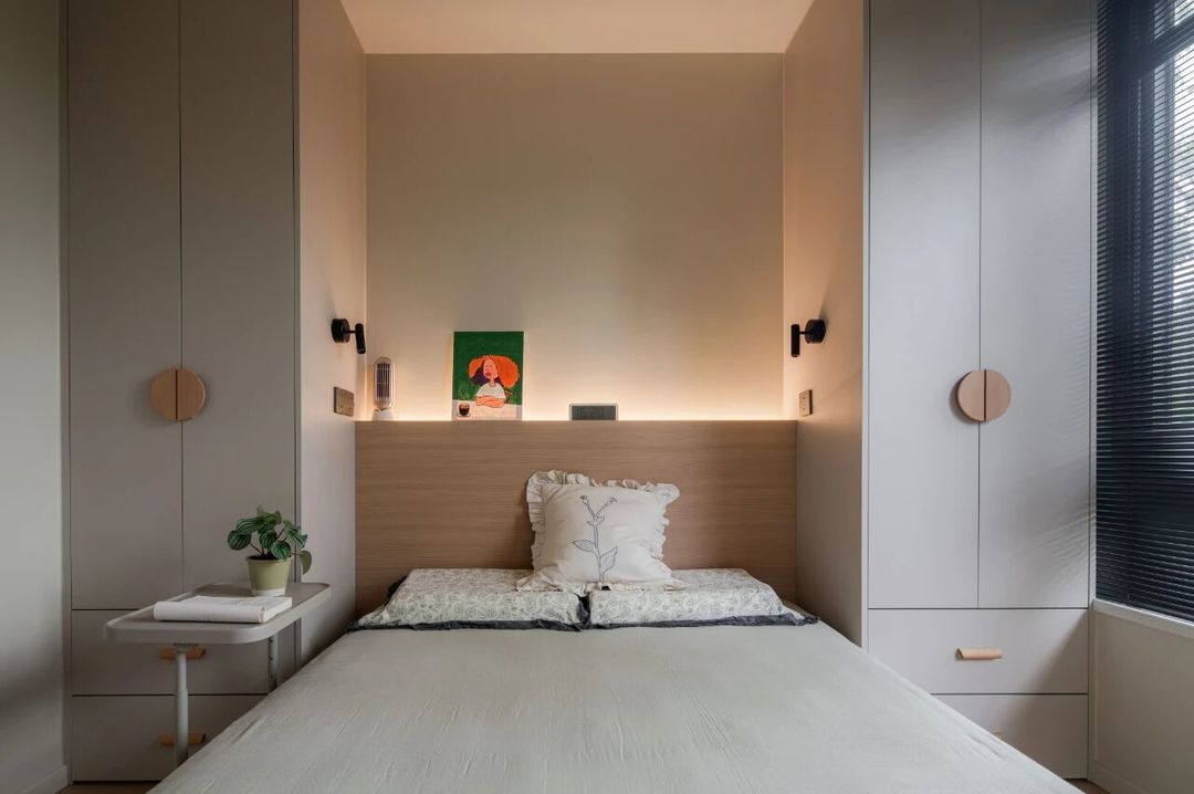 次卧很小,但特意做了不一样的布局——把储物衣柜放在了床头两侧,替代摆放在进门靠墙的空间。从衣柜体积上来说几乎和放在门口一样,但从功能上有以下几点优势: