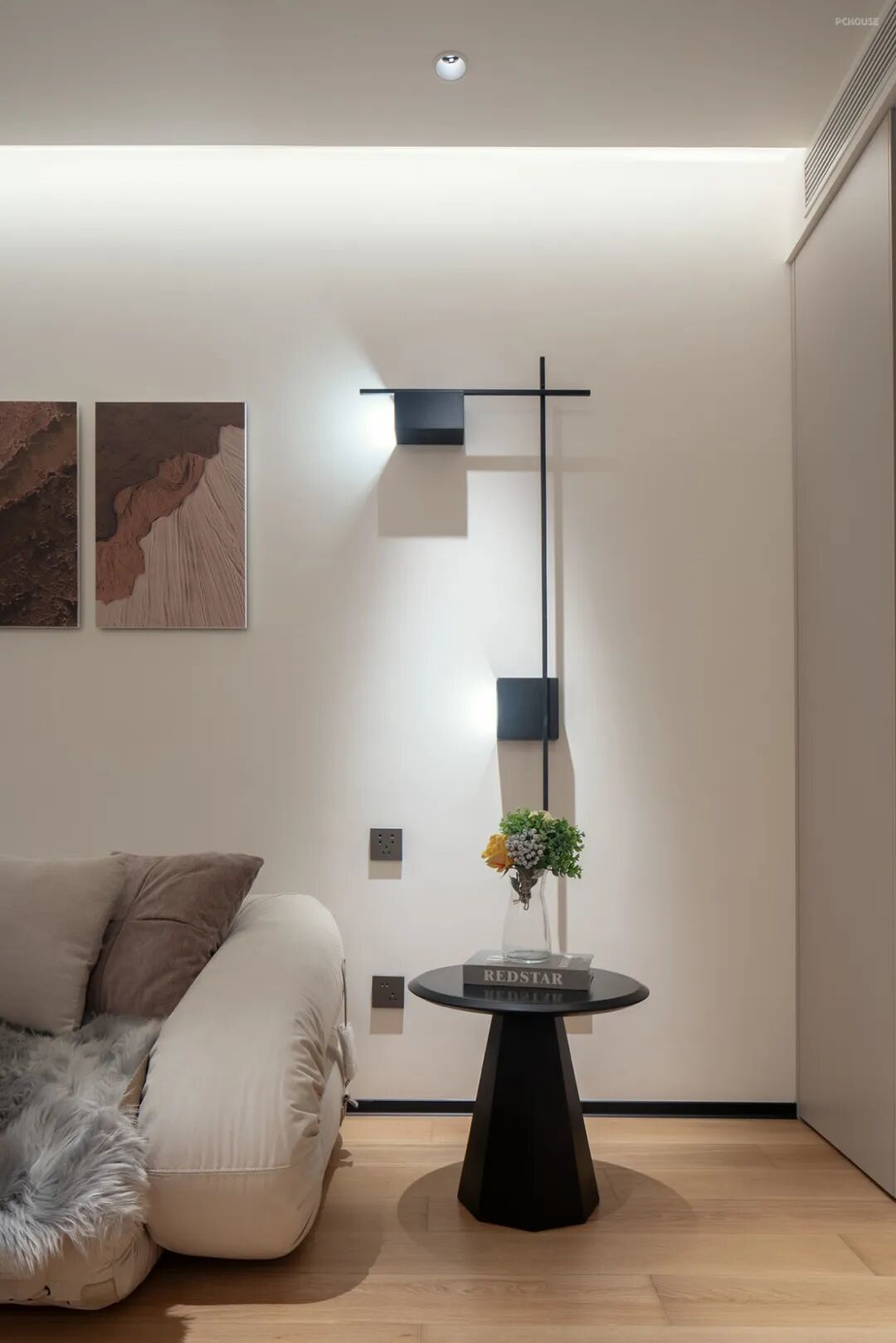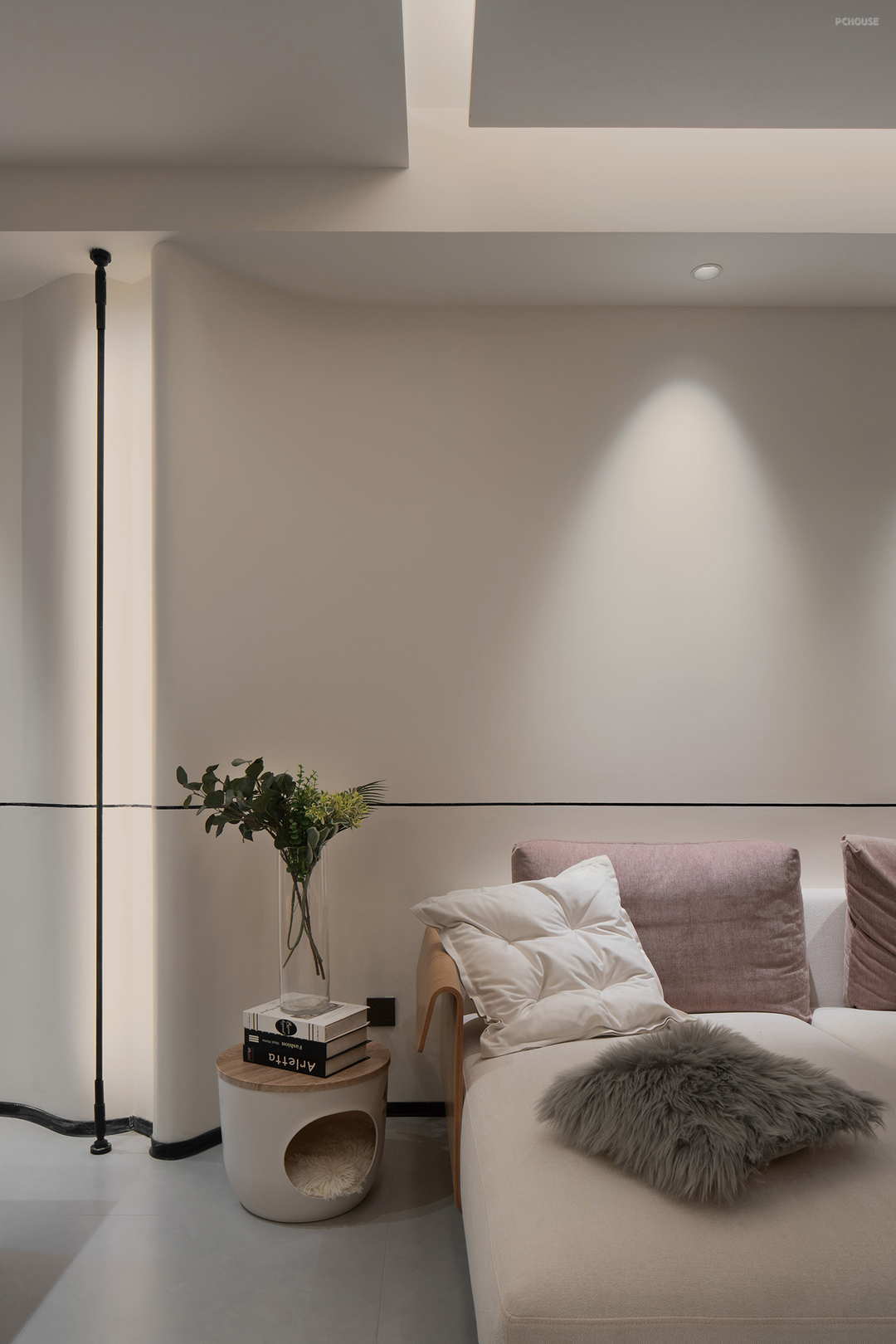 客厅的墙面内部有个水管,为了解决噪音和美观问题,打破客餐厅墙面的单调,增强灵活性,我们在墙面做了弧形的造型,并且通过灯光的映射,将单调的墙面转化为 “光影艺术装置”,既提升格调,又以柔和的暖光烘托氛围。