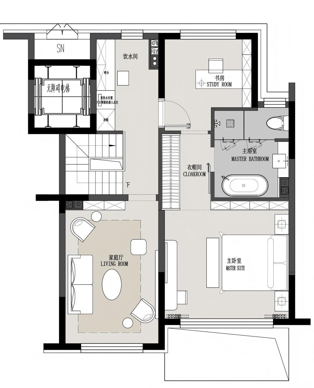 原来的次卫位置改成了水吧台。二层空间由原来的单一功能变成了主卧套房以及家庭厅和水吧间等多种功能空间。