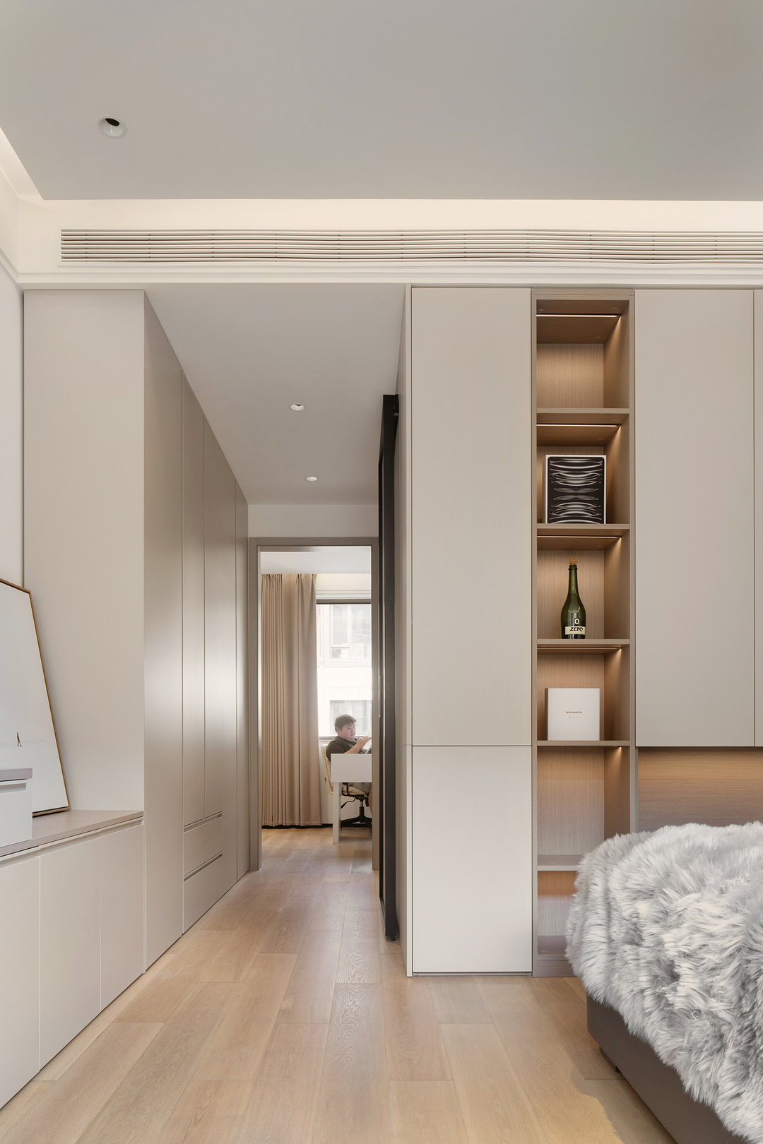主卧看向书房的视角,走廊是这个空间的功能中枢,左侧是衣帽间,右侧卫生间,向前到达书房。