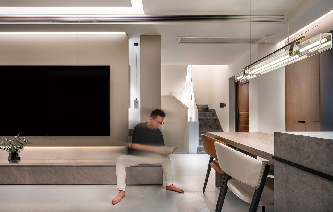 以客厅为出发视角,整体灯光层次温和舒适,电视墙底部暗藏灯带、天花板线性灯柔化空间轮廓,角落小吊灯为洗手台照明,餐厅线性吊灯集中照明,满足餐厨亮度、楼梯间装饰吊灯,线条灵动且富有韵律。每一处细节都彰显着设计师的独具匠心。
