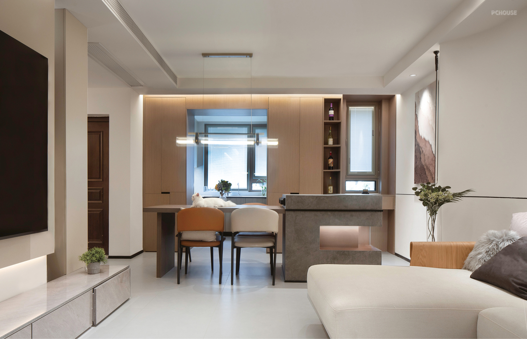 客厅与餐厅形成洄游动线,既提升空间利用率,又强化家人间的互动性。