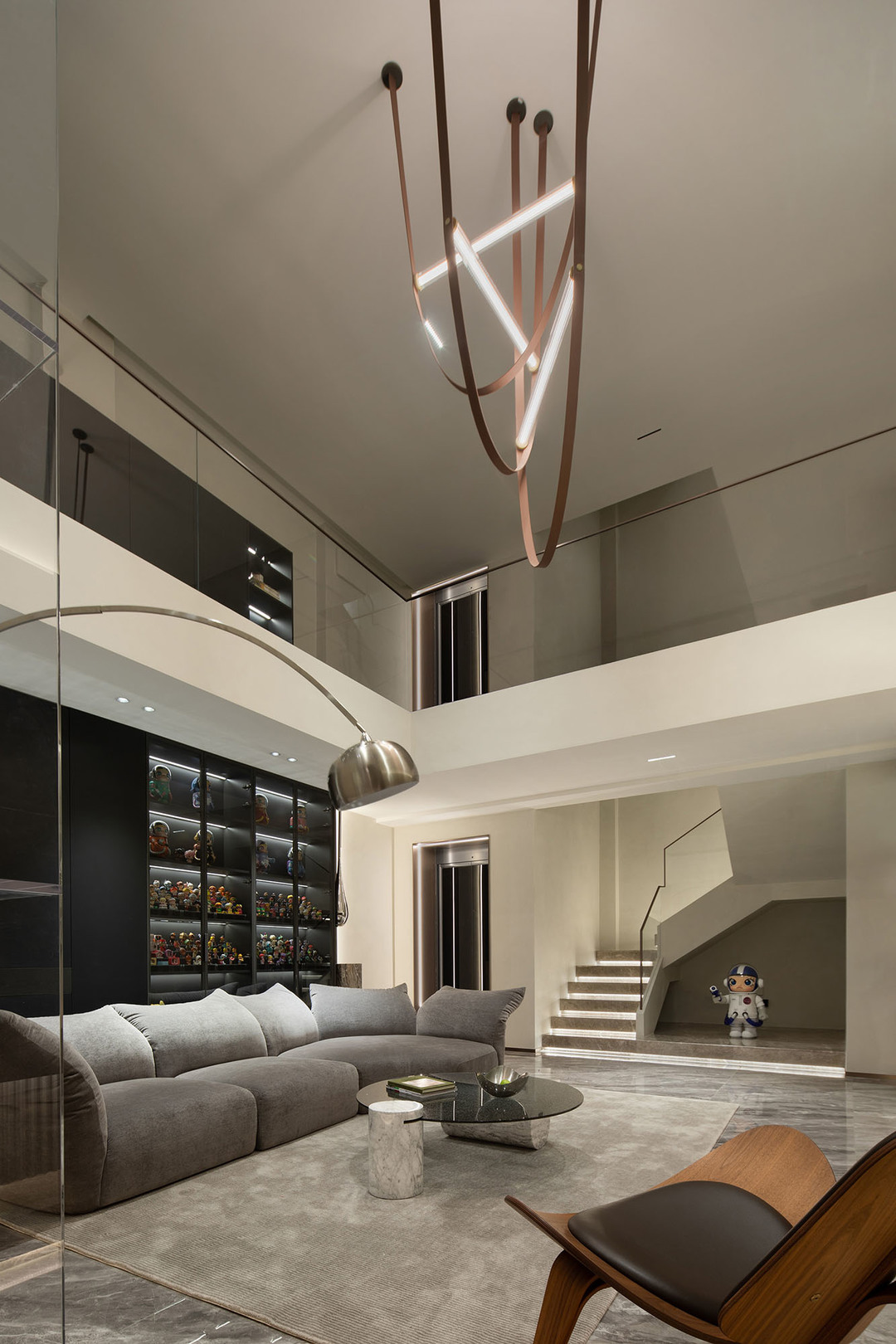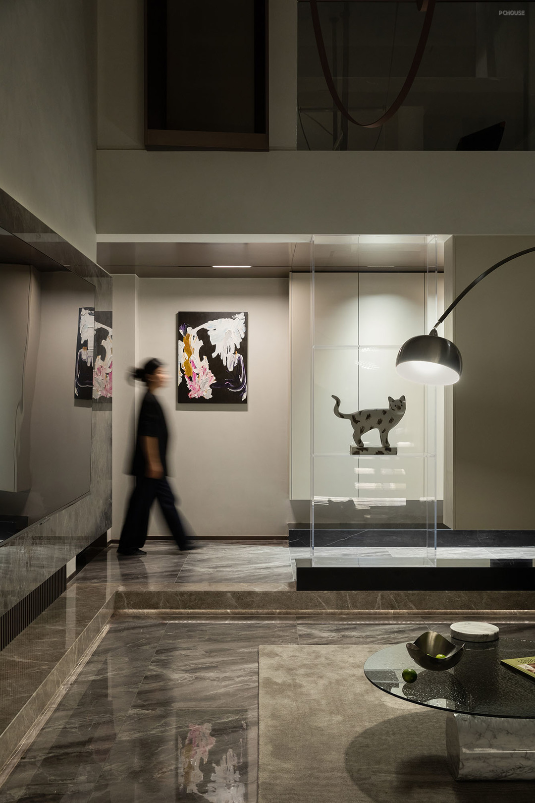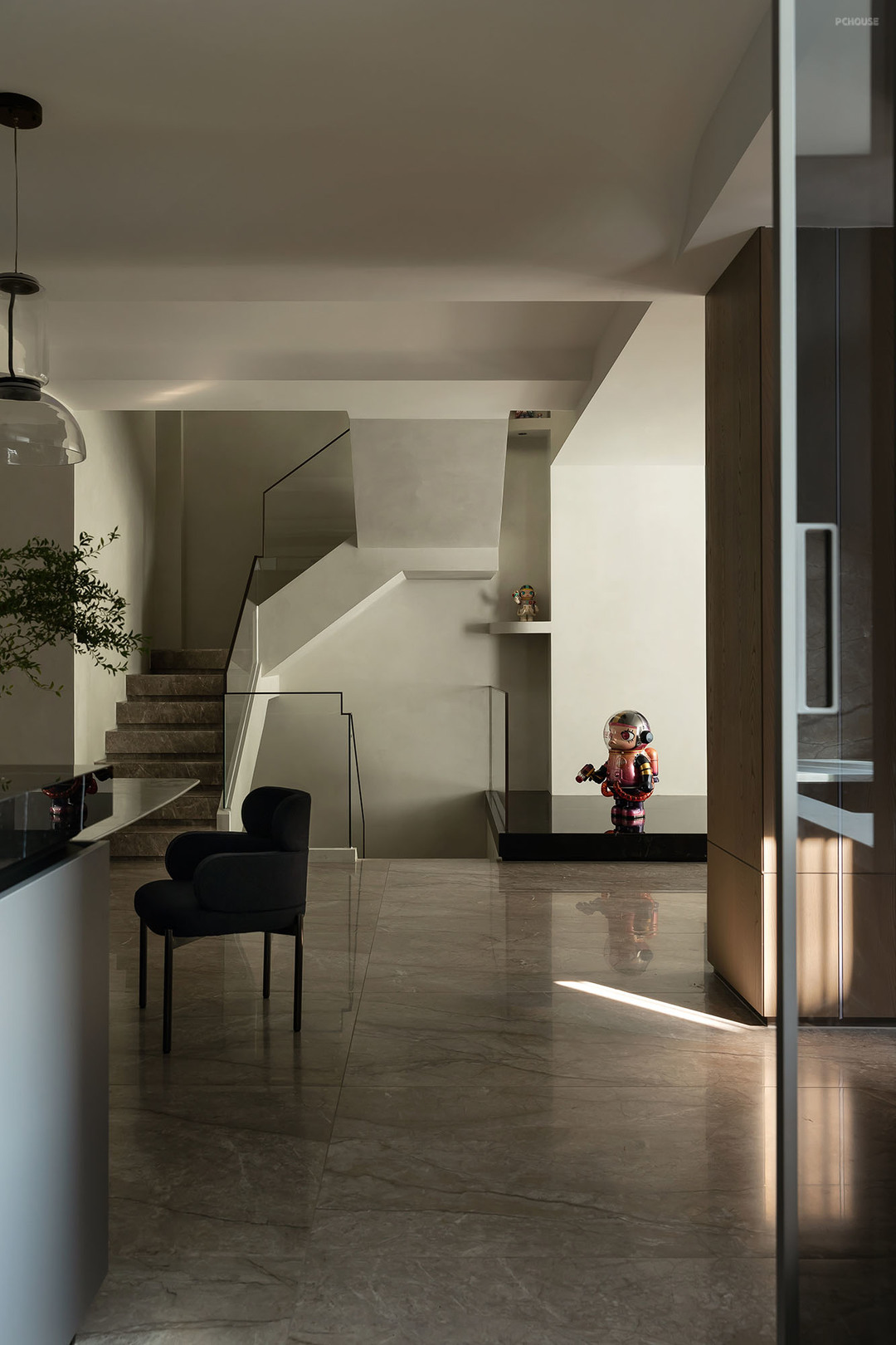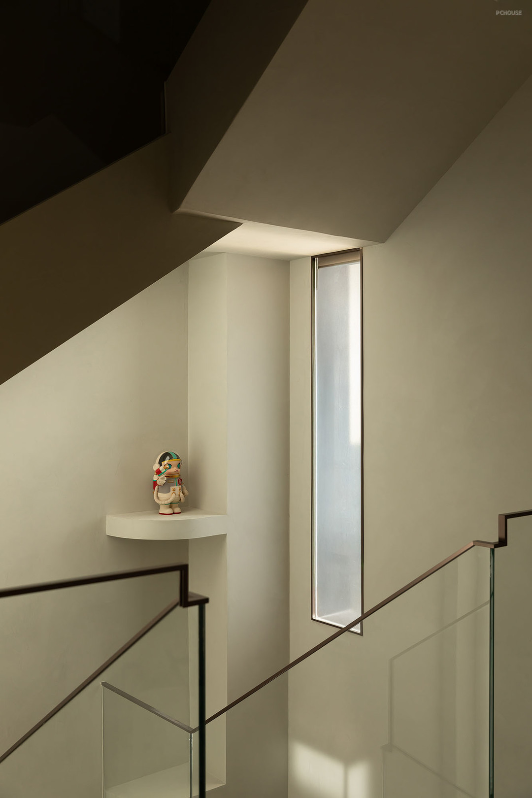 东芮希望这个空间除了承载全家人的生活,也可以完美的展示Molly玩偶,在上下的楼梯通道楼预留了挑空层板作为玩偶展示,展示区域的灯光也成为楼梯间的灯光,东芮收藏的玩偶们拥有了一个完美的“家”。